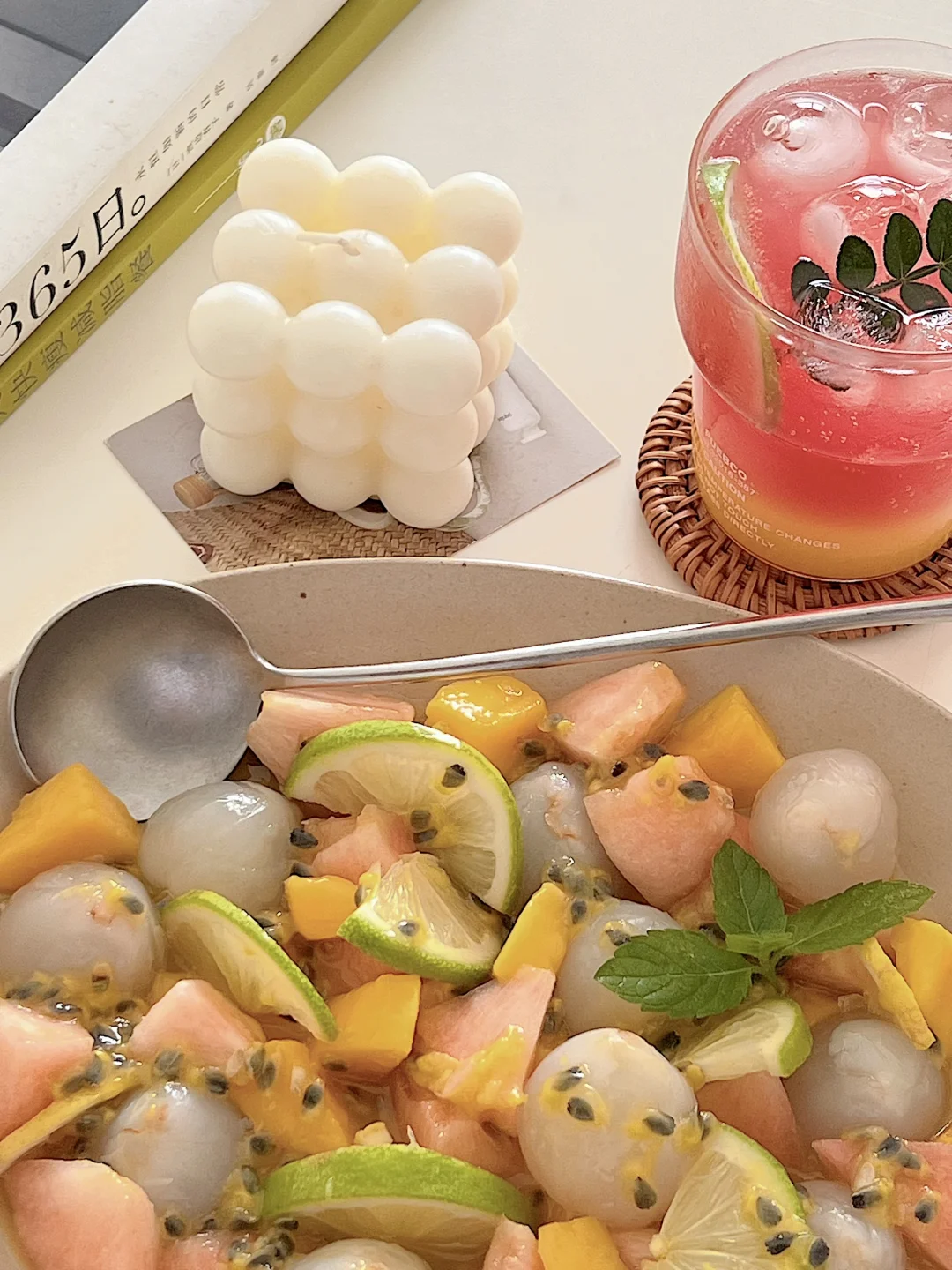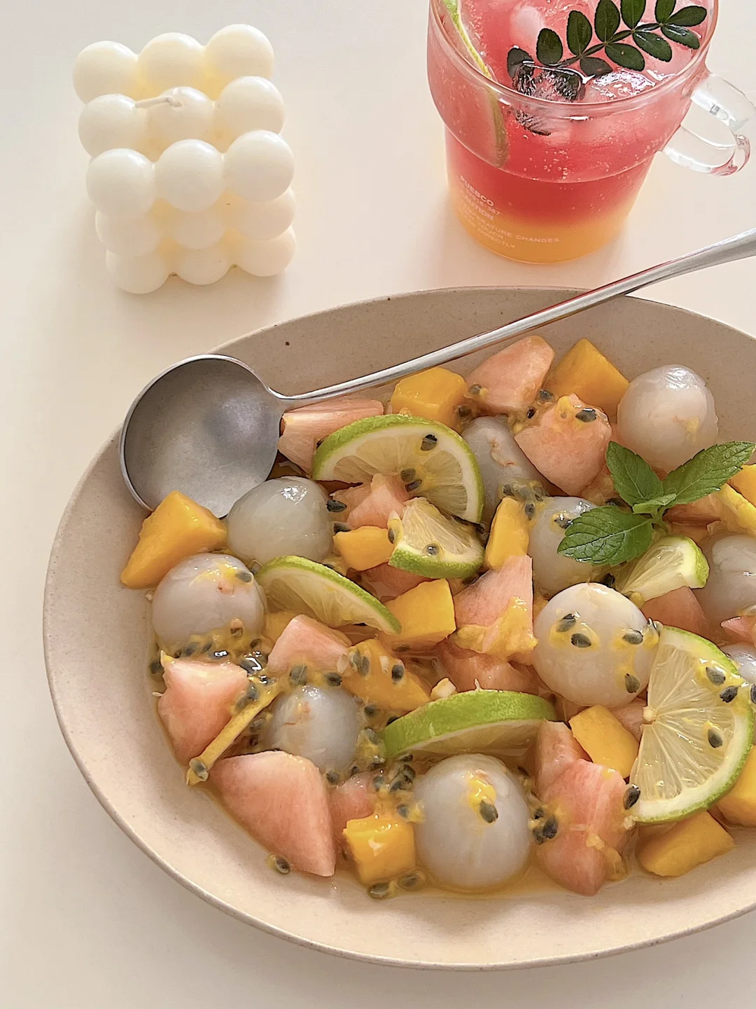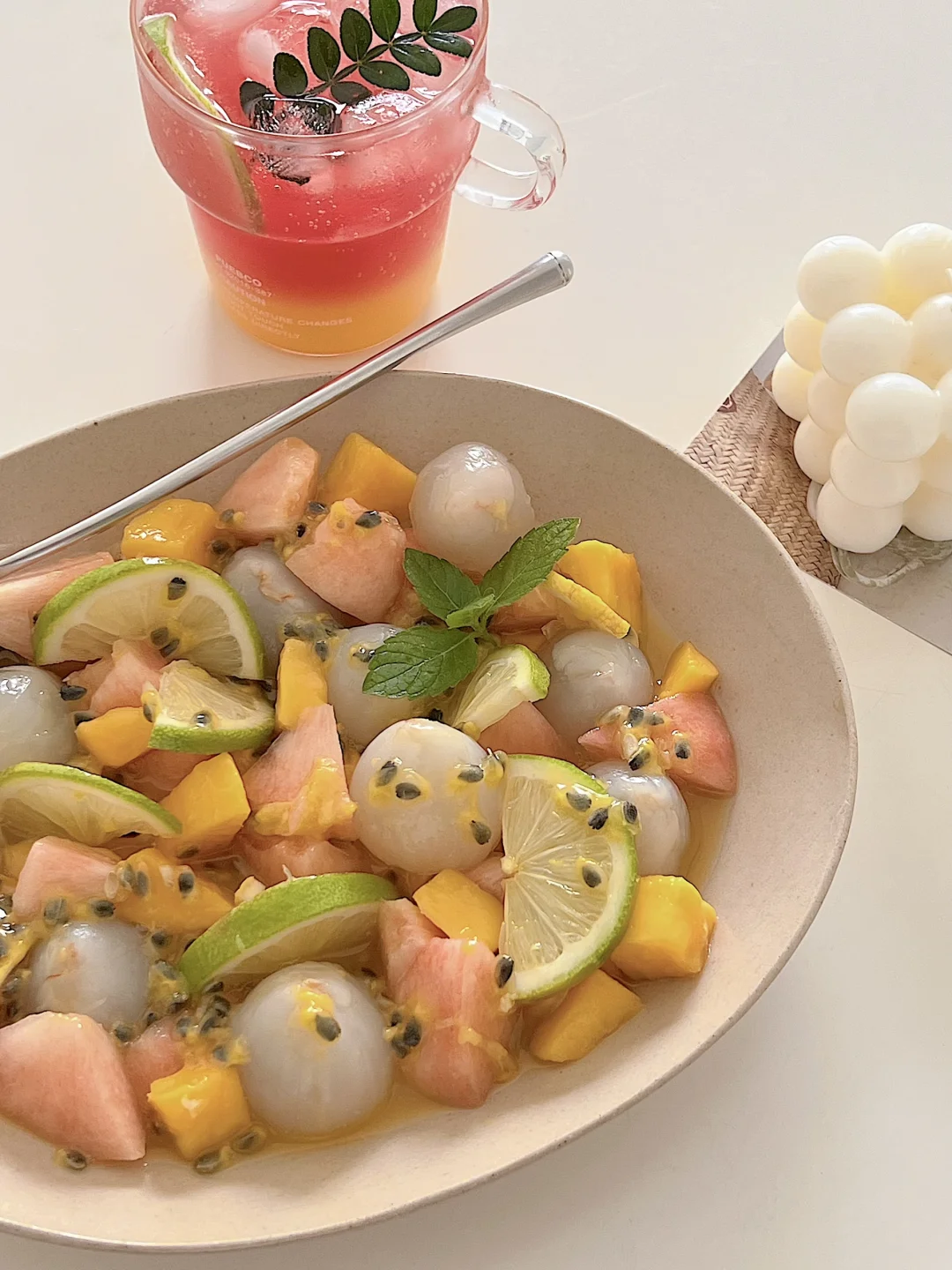 家里还有好多水果, 想办法消耗它, 好吃的渍水果又来了 做法: ✨荔枝去壳、水蜜桃、芒果去皮切块 ✨柠檬切片,加入百香果和蜂蜜🍯 ✨放进冰箱冷藏2小时以上即可 ❄️北方是不是要穿貂了 ☀️我在南方的艳阳里穿短袖吹空调吃水果