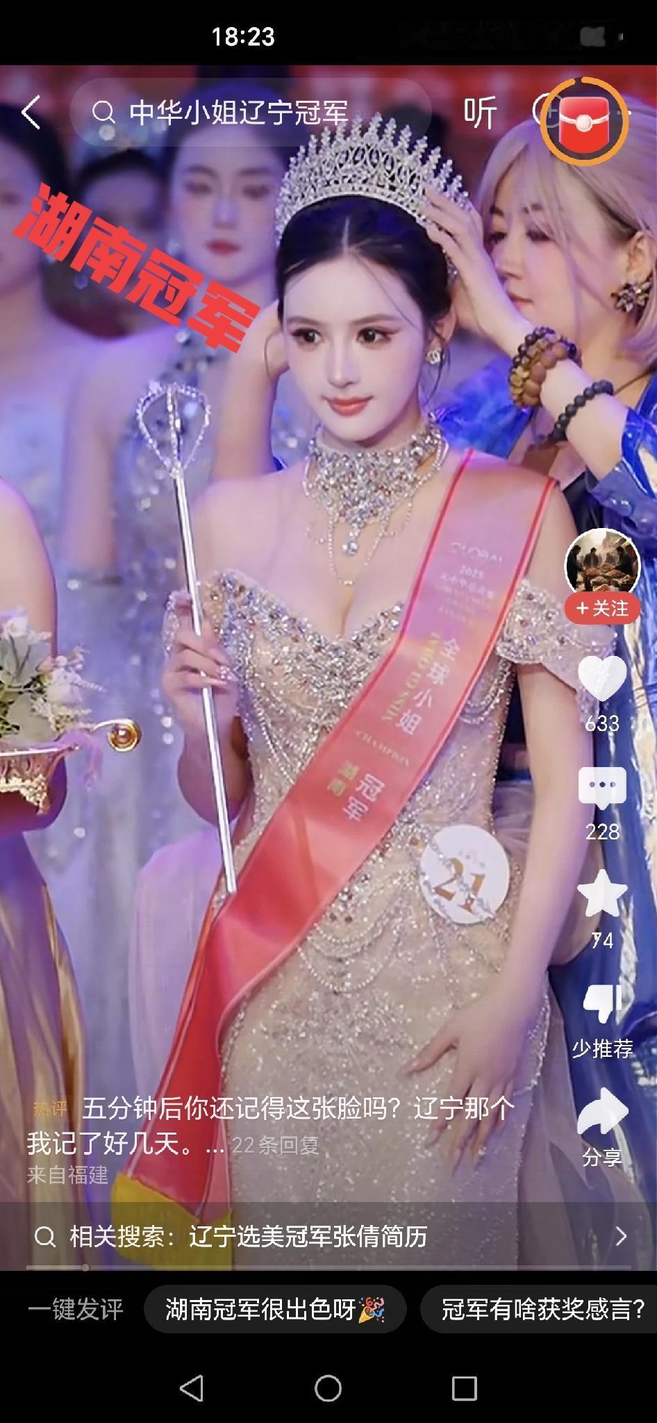 这个环球小姐选美,一山还有一山高…… 本来以为辽宁赛区冠军…已经…够出挑的了。结果,有人晒出了四川赛区冠军,很多网友顿时觉得四川冠军更胜一筹…… 后面我刷到了湖南赛区冠军,发现…,辽宁冠军、四川冠军看着好歹是活蹦乱跳的人,湖南赛区冠军美则美矣,可惜就是像个充气的…… 还好,全国冠军看着比较正常…,个子高,身材好,盘靓条顺……