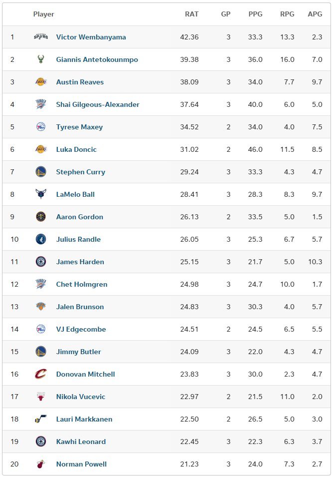 三场比赛后,文班亚马RAT值排名第一,综合表现最好。小里拿到51分准三双后攀升至第三,东契奇第六。