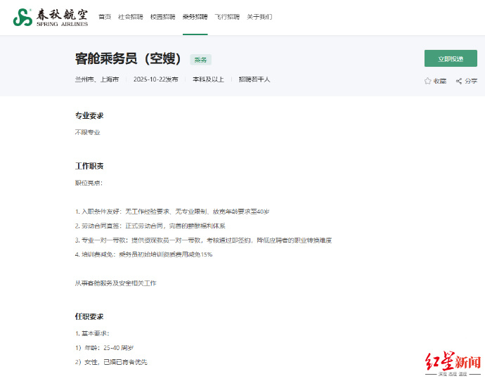 【#春秋航空已有88名在职空嫂#】#春秋航空74%空嫂晋升至管理岗#27日下午,红星新闻记者从春秋航空相关负责人处了解到,目前的“空嫂”招聘还在简历投递阶段,尚未进行数据统计。且招聘“空嫂”也并非该企业的首次举措,早在2010年与2013年春秋航空就曾招过一批已婚已育的空乘,“从这10余年的职业成长来看,88位空嫂中,74%已经晋升管理岗位。”