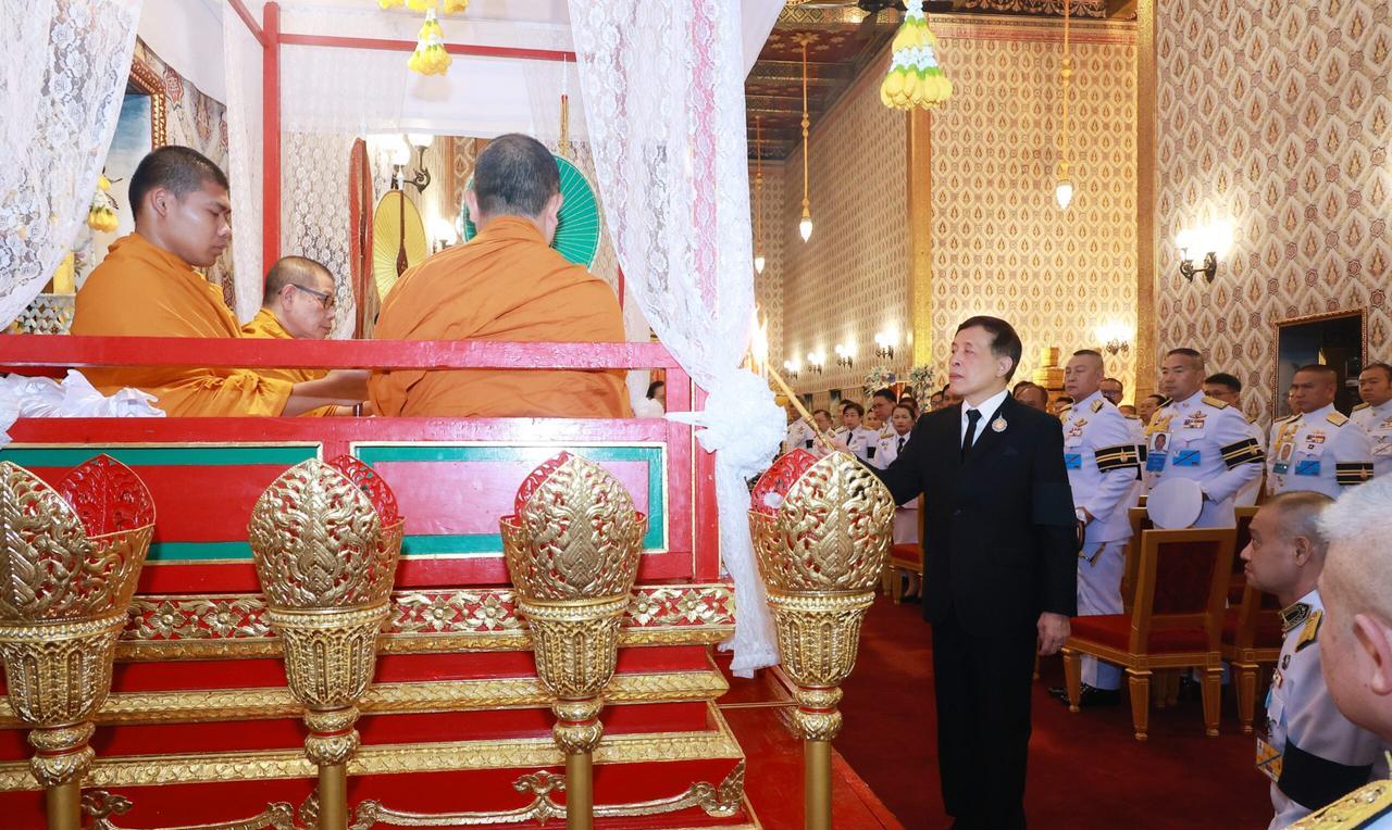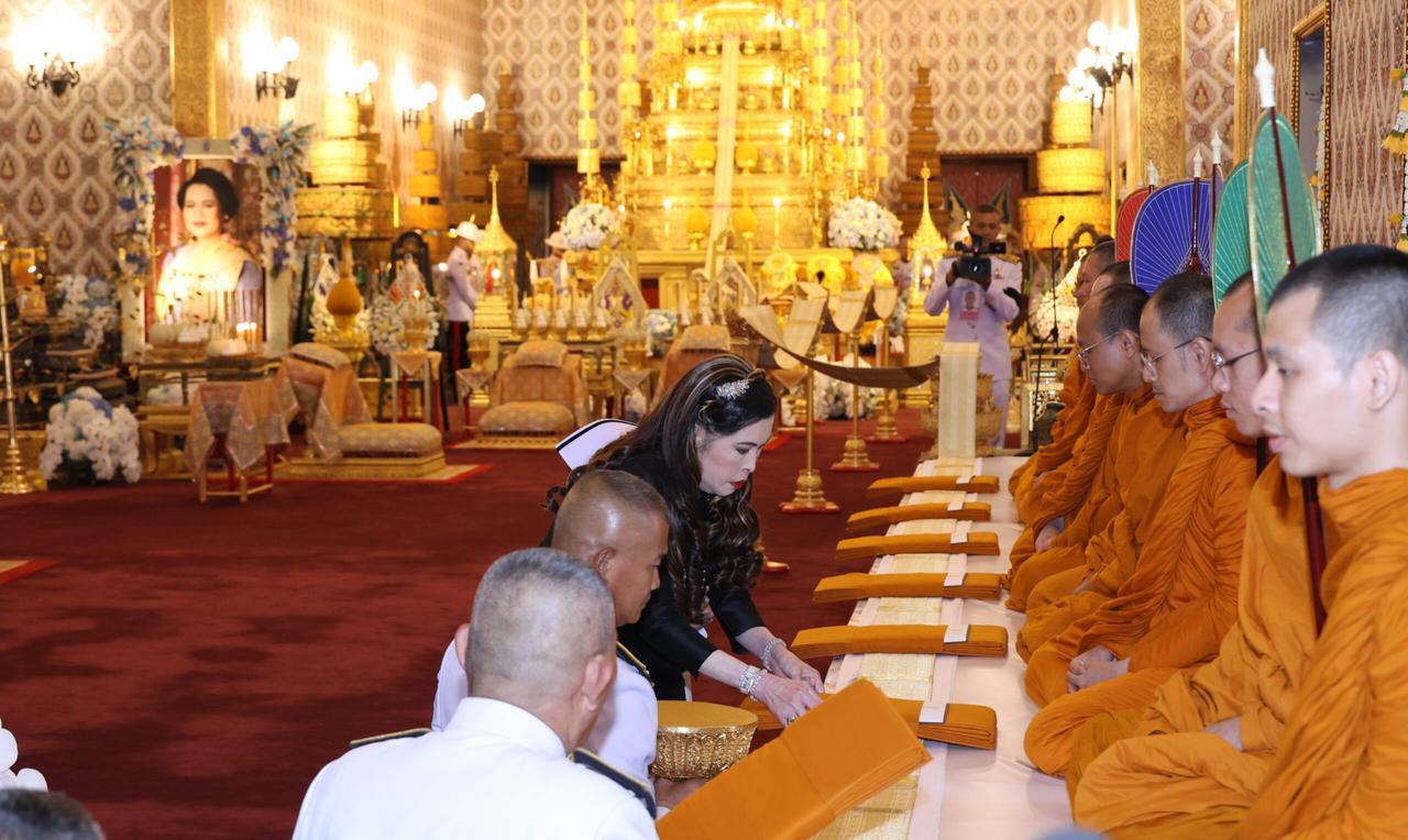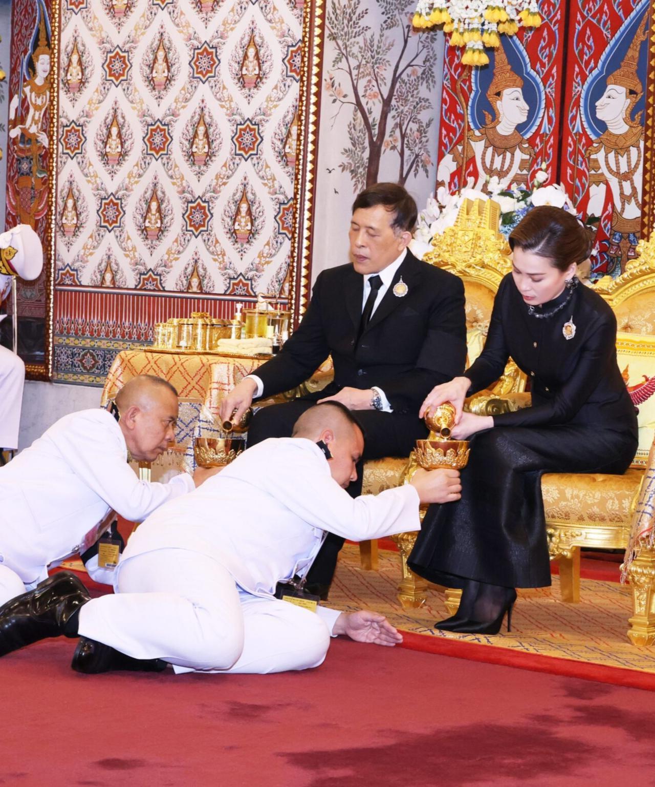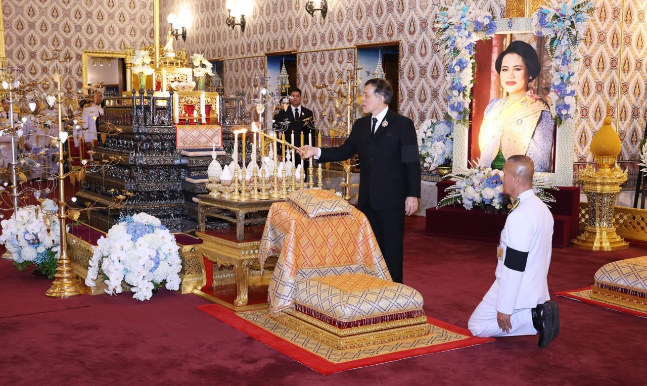 泰王率领王室成员,出席第二天国葬日活动 2025年10月27日晚7:14,国王陛下与王后陛下乘皇家车辆,前往大皇宫杜斯特玛哈普拉萨王座大厅。他们在此为已故诗丽吉王太后主持皇家功德仪式、诵读阿毗达摩。乌汶叻公主、思蕊梵公主及提帮功王子一同随行。