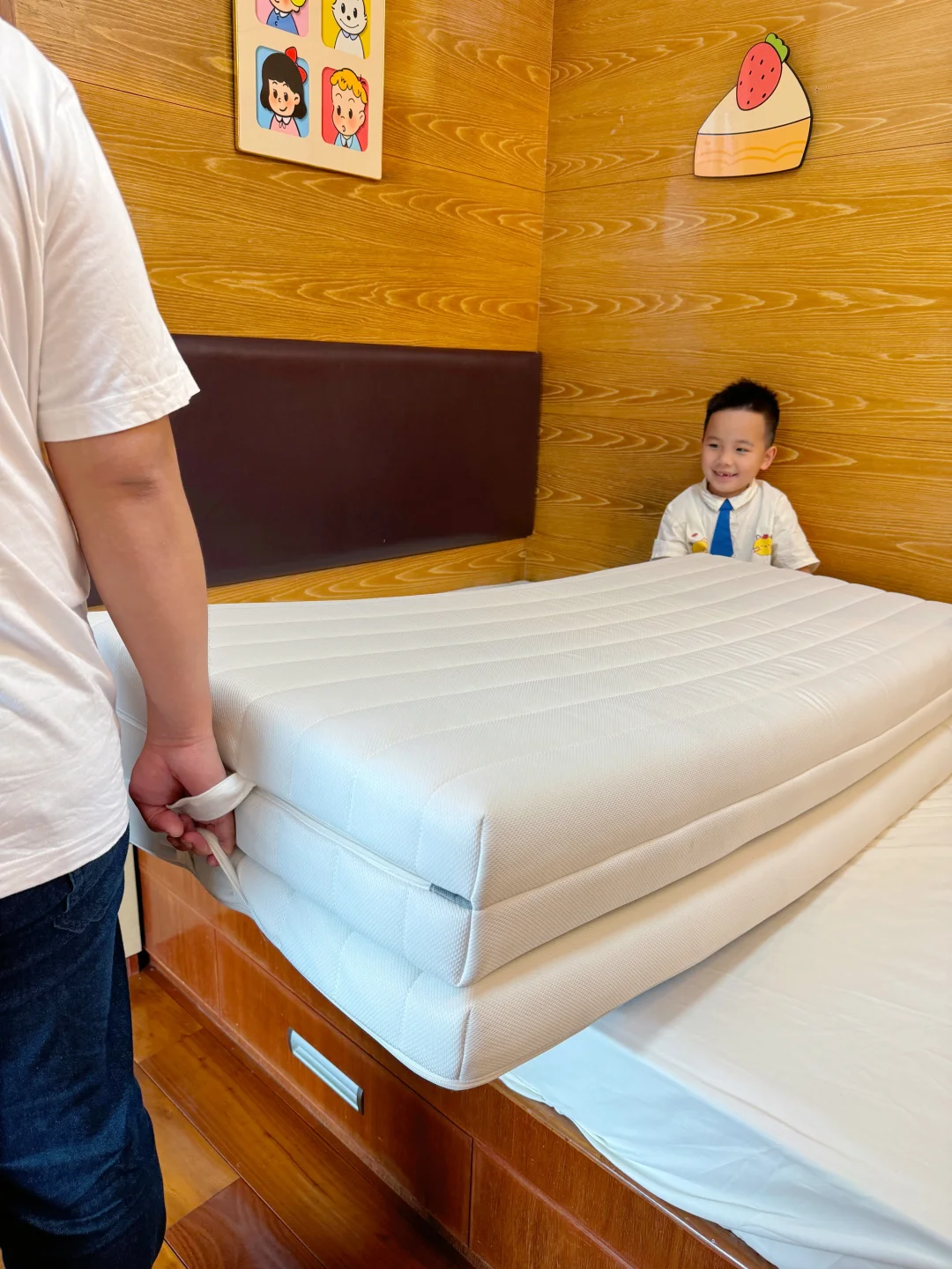 一直生活在广州的我,最头疼的就是回南天😂yeye的床垫三天两头潮乎乎的☔️边角长霉斑不说,拆洗一次累得腰酸背痛——普通床垫又厚又重,扛到阳台晒干简直像搬家。yeye睡觉还不老实,尿渍、汗渍、零食渣全往缝里钻。去年他背上起红疹,👩🏻⚕️一句“可能和床垫潮湿有关”,让我意识到,床垫不仅要舒适,更需要会“呼吸”👃我也因此决定换床垫