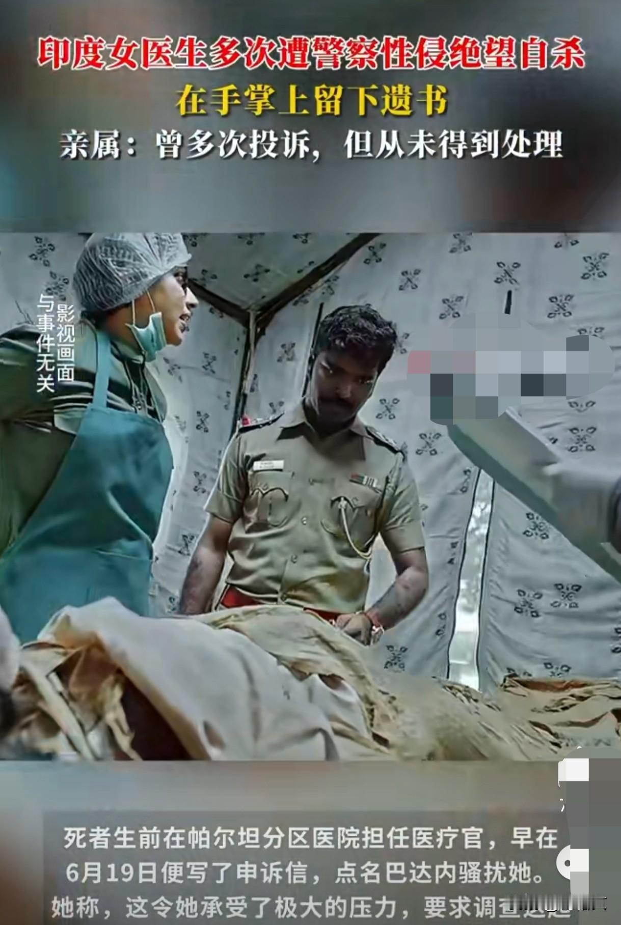 手掌写遗书自杀!印度女医生遭警察性侵,4个月申诉石沉大海太绝望 最近印度这事儿看得人牙根直痒——23号晚上,马哈拉施特拉邦的女医生在医院自杀,左手手掌上写满遗书,字字都是血泪控诉。 她在信里明明白白说,当地警察副督察戈帕尔·巴达内,多次对她实施性侵,还没日没夜地搞身心虐待,把人往死里逼。 不光有警察作恶,软件工程师班卡尔也跟着添乱,天天对她进行精神骚扰,俩人为非作歹,把她的生活搅得鸡犬不宁。 这女医生可不是没反抗过。早在6月19号,她就写了申诉信,直接点名巴达内的恶行,说自己快扛不住压力了,求着相关部门调查处理。 可让人寒心的是,这封信寄出去就石沉大海,没人管、没人问。她在医院当医疗官,负责尸检工作,还被当地政客逼着改医疗报告,多次投诉也没用。 一边是性侵和骚扰的折磨,一边是投诉无门的绝望,她撑了四个月,最后还是没熬过这黑暗。直到她自杀的消息传开,相关部门才慌了神。 当地首席部长赶紧下令把巴达内停职,又成立专案小组抓班卡尔,25号总算把班卡尔逮着了。可这一切,都晚了,人都没了,再补救有啥用? 死者亲属说的话更戳心:“她早就受不了了,政客逼她改报告,警察害她,投诉多少次都没人理,这是把人往绝路上推啊!” 这可不是个案。前两年印度就有女实习医生在医院被性侵杀害,当时闹得沸沸扬扬,结果呢?该犯事的还犯事,女性安全还是没保障。 为啥这些人敢这么嚣张?还不是因为投诉渠道走不通,官官相护的漏洞太多。警察本是护人的,结果成了害人的,这叫啥事儿? 想避免悲剧重演,首先得把投诉通道打通——不管是谁投诉,都得有回应、有调查,不能让信石沉大海;其次,对涉案的警察、政客,得从重处罚,不能轻描淡写。 更重要的是,得给女性足够的保护。遇到侵害时,有地方躲、有人帮,而不是叫天天不应、叫地地不灵。不然,这样的悲剧还会一次次上演。 网友说得对:“迟到的正义不是正义,这女医生要的是活着时有人帮她,不是死后才有人追责。”这话戳中了要害,也道出了多少人的无奈。 你觉得这事儿最让人愤怒的地方在哪?该咋做才能真正保护好那些受欺负的人?