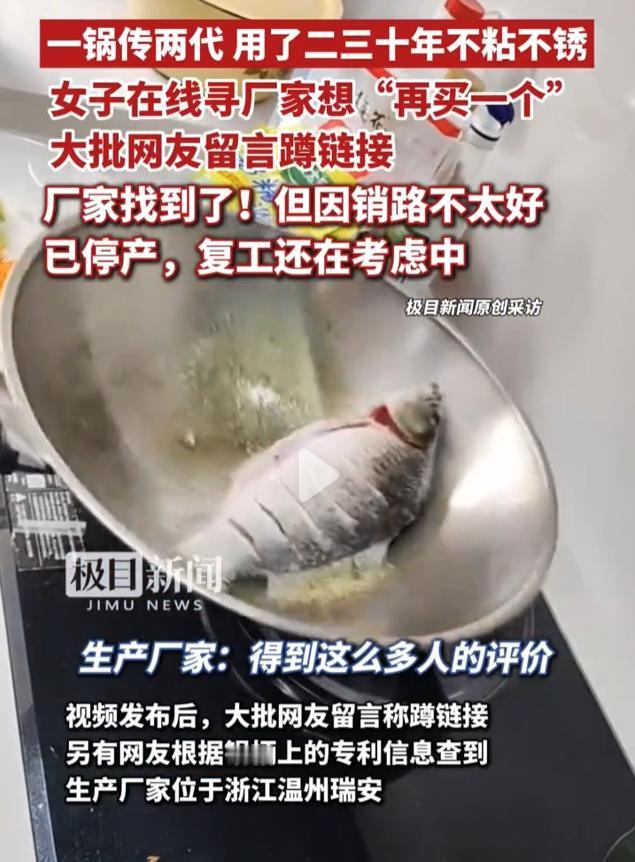 用了30年都像新一样的不粘锅, 不是因为销路不好卖, 也不是因资金断裂而卖不出, 而是因为太耐用而不好卖,一用几十年的锅,别人买一个就用两代,肯定销路不好啊。 近日,一位女子想求购买一款三十年前的锅,这口锅也是从她妈妈的时候就用下来的,视频中那口锅,虽然三十年不停地用,但是可以看出锅底还是很铮亮,看着和新的差不多,煎起鱼来非常的顺滑,难怪女子想再买一个。 网友也说,商家倒闭无非是两个原因,一是产品质量差,而是产品质量非常好,以至于都不需要再买。 二三十年前的商家,总是想方设法做出质量最好的产品,脑子都是一根筋,像以前的飞鹿牌风扇,买了39年都不坏不用修,这些商家都生存不到现在。 现在的商家设计产品的时候,都讲究计划性报废,像一个灯泡,用个几年就得了,没有必要设计用上几十年的产品,不然怎么赚钱? 可现在的消费者也是醒悟了,知道质量才是硬道理,而且现在互联网发达了,不像以前质量好的产品都传不出去村外,只要产品质量好,全国人民每人买一个都可以把商家养活,而不至于倒闭,希望那口不粘锅能重新生产,希望全国的商家都跟着学习,真正把质量好的产品做出来。