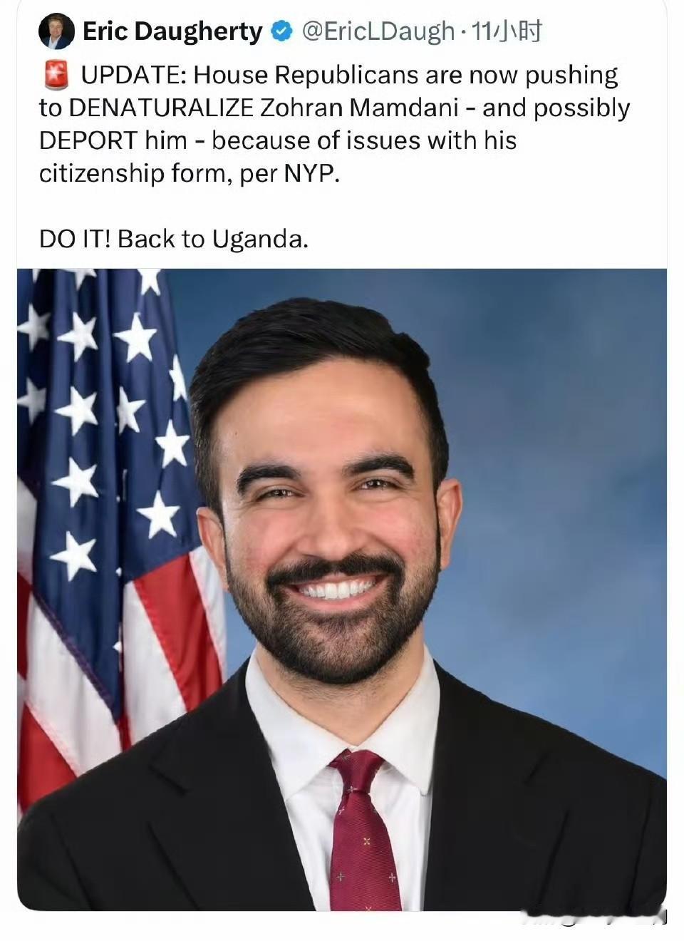 《纽约邮报》前天报道,众议院共和党人正推动取消佐兰·曼达尼美国国籍的行动,并将其驱逐出境,赶回乌干达。理由是他的公民身份申请表存在问题。 佐赫兰·曼达尼(Zohran Mamdani),政治新星,民主党,纽约州议员,白左,移民爱好者,正在竞选纽约市市长,支持率第一[抠鼻] 共和党这样搞就没劲了,说不定他是未来的美国总统呢
