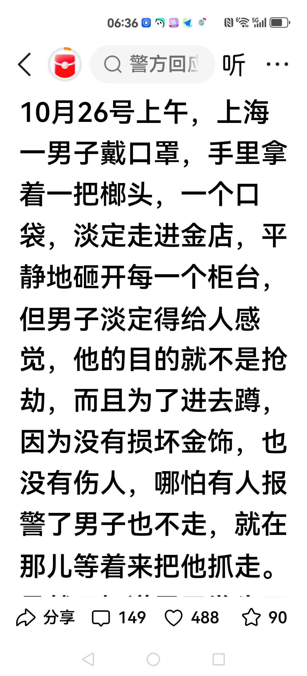 【他是想进去?】 上海 10月26号中午 一男子戴着口罩,手里拿着榔头,走进金店。 他非常镇定自若砸开柜台上所有玻璃 但是他没有抢黄金,而是平静等待警察。 看来他的目的想进去,而不是抢劫。 是什么让他感觉在外面不安全吗?还是另有隐情?