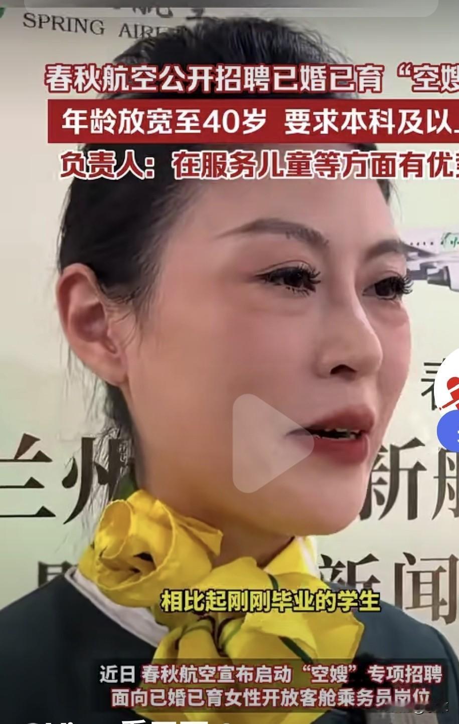 谁说40岁已婚中年女性 不能当空嫂了 看到近日春秋航空的招聘广告 他们公司开始招聘空嫂 年龄放宽到40岁的已婚女性 也就意味着 以后航空公司不再招年轻貌美的20出头年轻小姑娘了 40岁中年已婚女性在航空服务领域也有了市场 哈哈😄 这是个好消息对已婚中年女性来说,你们说呢 有条件中年40岁女性可以报名当空嫂了[呲牙]她们当空嫂也会很有优势,尤其是服务小孩和老人方面…… 更有耐心 全职宝妈求职 中年女人失业 失业中年女人 大龄空姐 航空乘务员求职