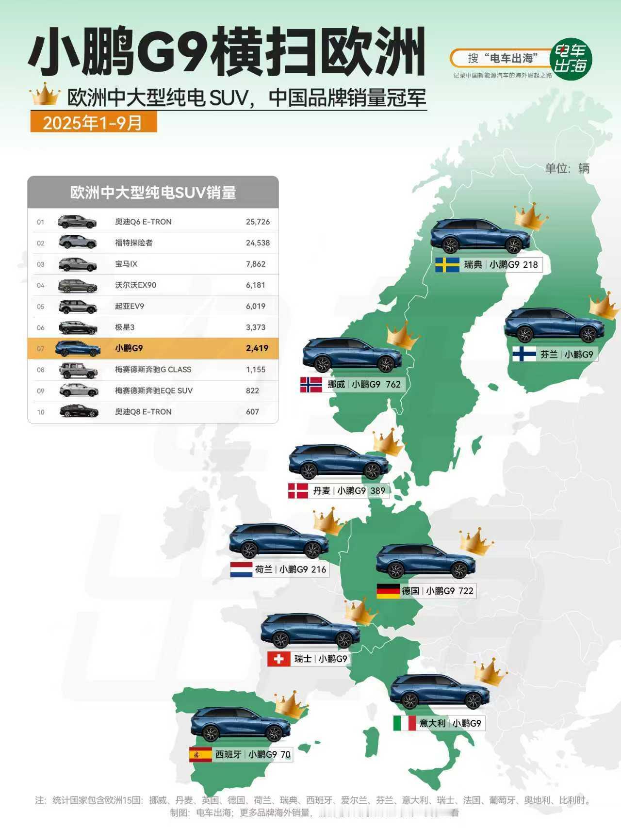 产品上,小鹏G6和G9 成了“出海双子星”。G6在挪威、德国、西班牙成了中国新势力销冠;G9更硬核,是欧洲中大型纯电SUV销量榜里,唯一入围的中国车,在意大利、德国都拿过细分市场第一。一个走量,一个立标杆,配合得恰到好处。小鹏G6和G9狂揽欧洲9国销冠