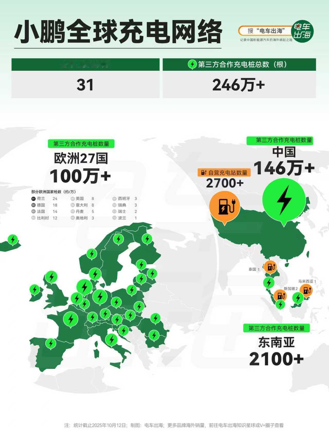 出海不是“运出去就行”。我上个月也提过,小鹏海外门店已突破270家,覆盖近50个国家。更关键的是充电基建也没落下,他们没自己硬干,而是选择和本地巨头合作,比如欧洲的 Plugsurfing、东南亚的 Charge Plus,一口气把充电网络铺进30多国,接入了超过 246 万根充电桩。用车方便,才是销量起来的基础逻辑。