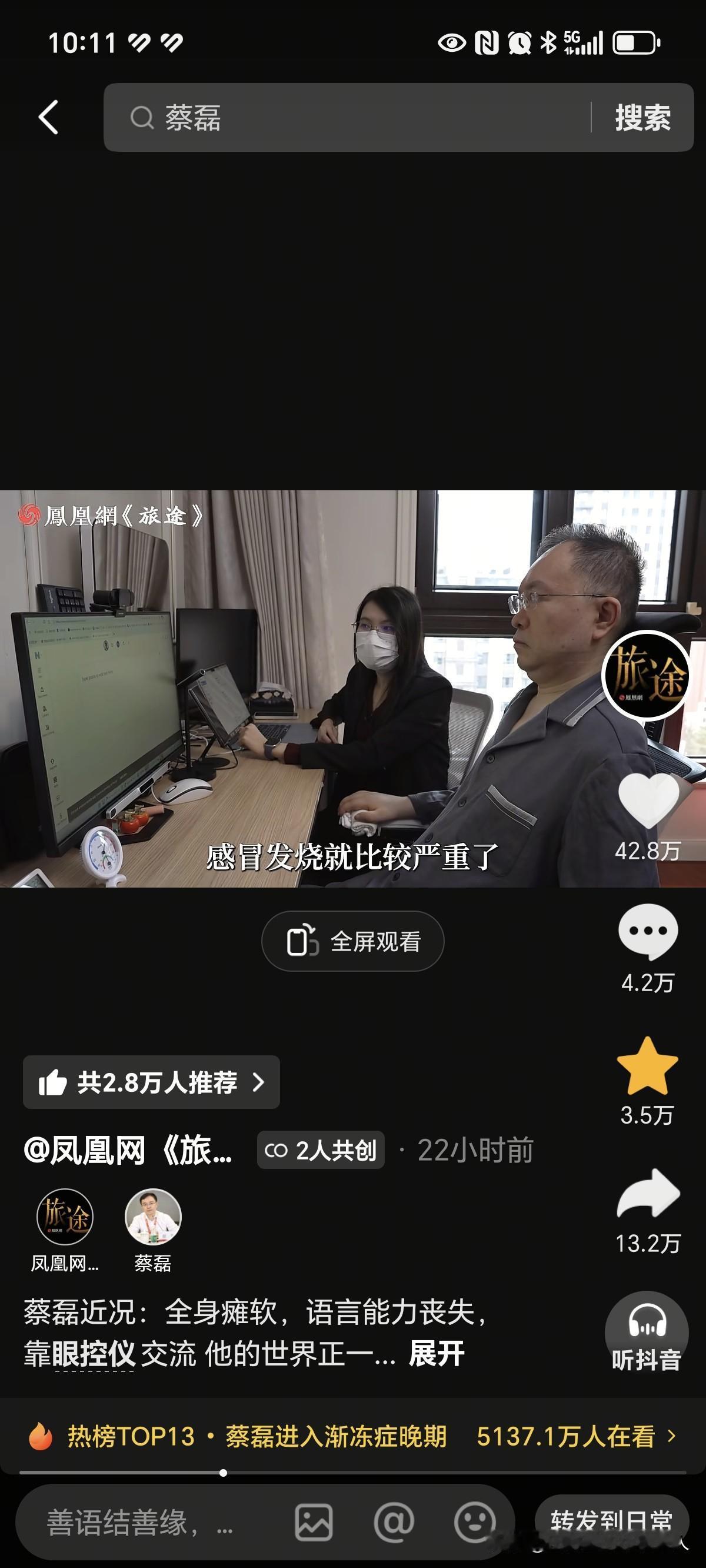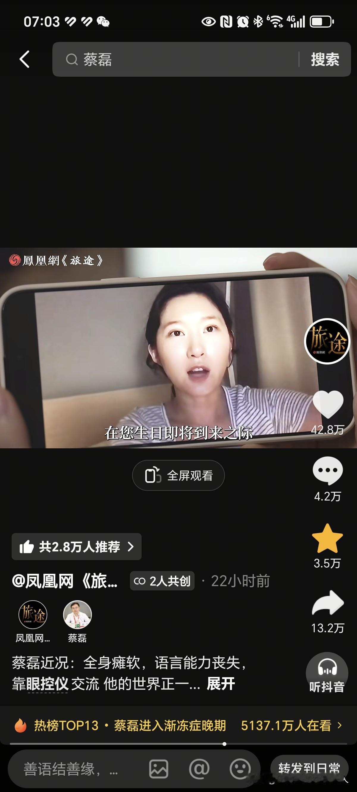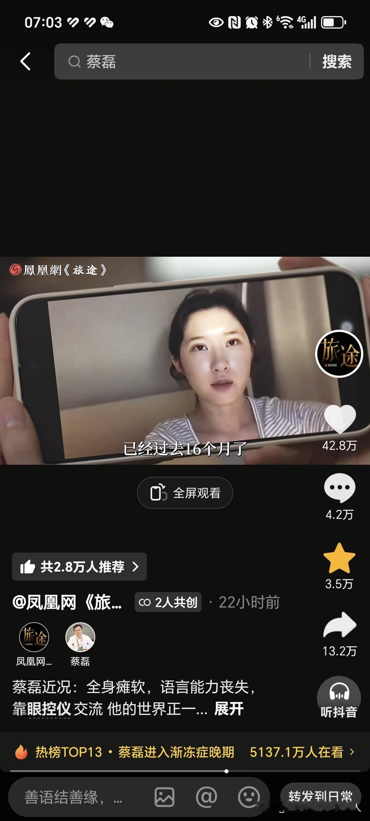 近日,凤凰网《旅途》节目组去蔡磊家里进行了采访,其中释放了2点信息! 第一,为啥天天呆在屋子内,去楼下晒晒太阳也对身体好呀?原来去年五一去小区散过步,尽管保护的很严实,可还是受凉了,住了7天icu才救过来,所以不敢下去了。哎,失去了户外活动,整天呆在屋子里,换作是谁都会压抑呀,太不容易了。 第二,投资了几个亿去研发药物,可听助理美女科普说:蔡总不属于基因型患者,而这些药物只能够对基因型患者有延长生命的作用,其中一位美女患者受益了,还特意打视频来感谢。 这说明钱没有白花呀,但是看见别人有了效果,自己内心并没有失落,依然继续投资,这也证明了大公无私的精神。 现在已经进入晚期了,每天吃流食,虽然营养丰富,但本人给9个月女儿弄过辅食,基本相似,味道不好听,难以下咽呀。 除此之外,需要3个阿姨帮忙才能活动,可蔡总依然坚持每天工作,不敢怠慢,网友不理解,歇歇不好吗? 其实,这就是一份执念吧,而正是拥有这份执念,才是活下去的动力之一吧[可怜]。