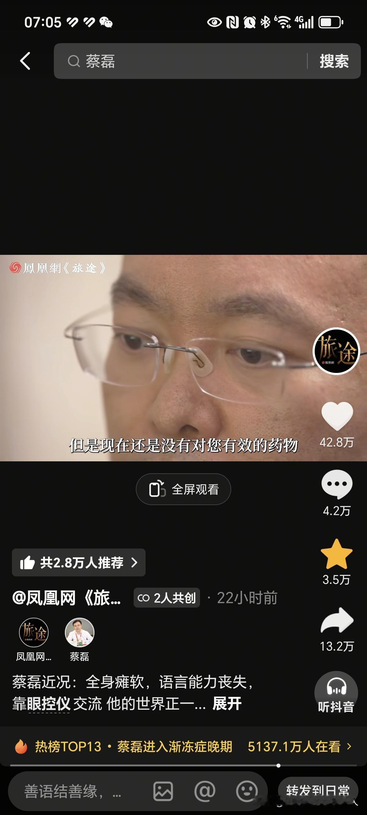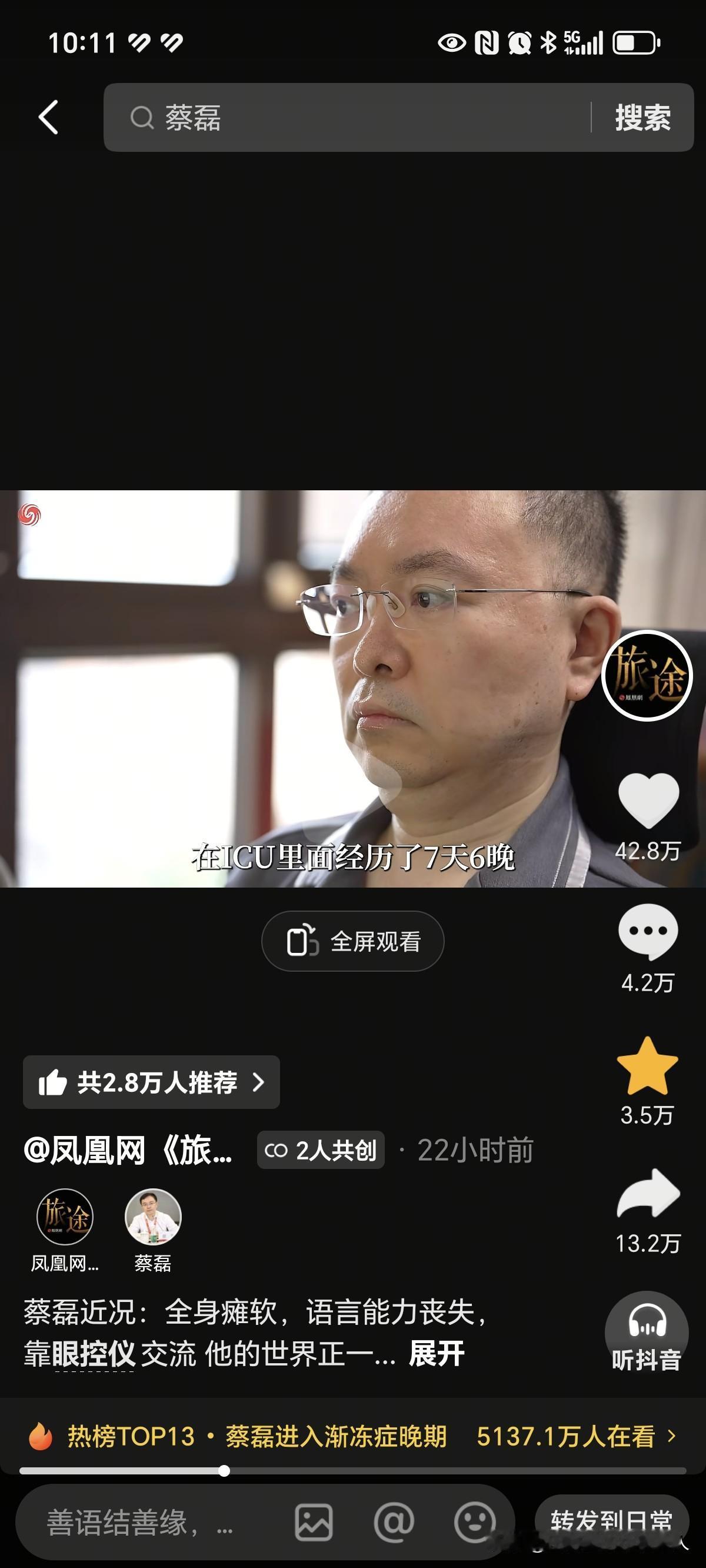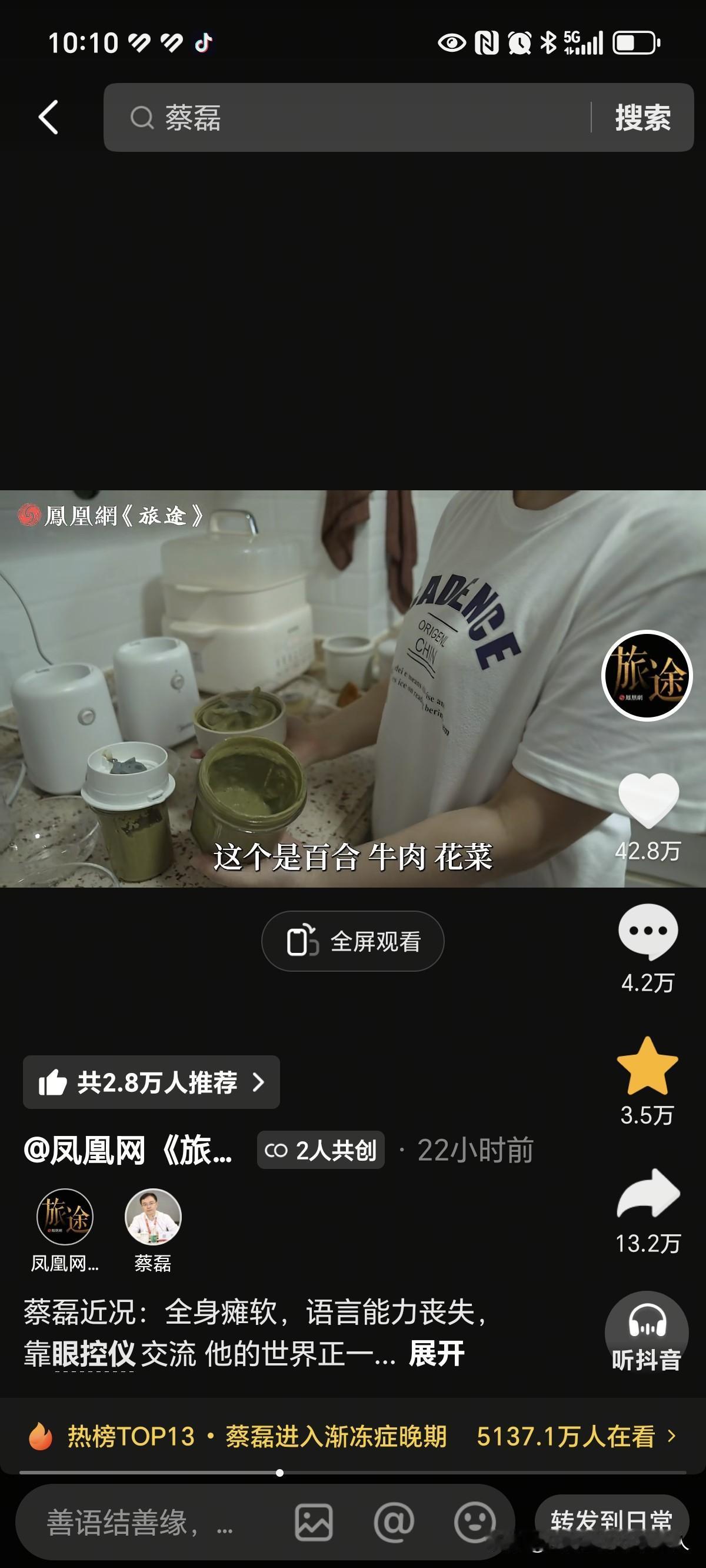 近日,凤凰网《旅途》节目组去蔡磊家里进行了采访,其中释放了2点信息! 第一,为啥天天呆在屋子内,去楼下晒晒太阳也对身体好呀?原来去年五一去小区散过步,尽管保护的很严实,可还是受凉了,住了7天icu才救过来,所以不敢下去了。哎,失去了户外活动,整天呆在屋子里,换作是谁都会压抑呀,太不容易了。 第二,投资了几个亿去研发药物,可听助理美女科普说:蔡总不属于基因型患者,而这些药物只能够对基因型患者有延长生命的作用,其中一位美女患者受益了,还特意打视频来感谢。 这说明钱没有白花呀,但是看见别人有了效果,自己内心并没有失落,依然继续投资,这也证明了大公无私的精神。 现在已经进入晚期了,每天吃流食,虽然营养丰富,但本人给9个月女儿弄过辅食,基本相似,味道不好听,难以下咽呀。 除此之外,需要3个阿姨帮忙才能活动,可蔡总依然坚持每天工作,不敢怠慢,网友不理解,歇歇不好吗? 其实,这就是一份执念吧,而正是拥有这份执念,才是活下去的动力之一吧[可怜]。