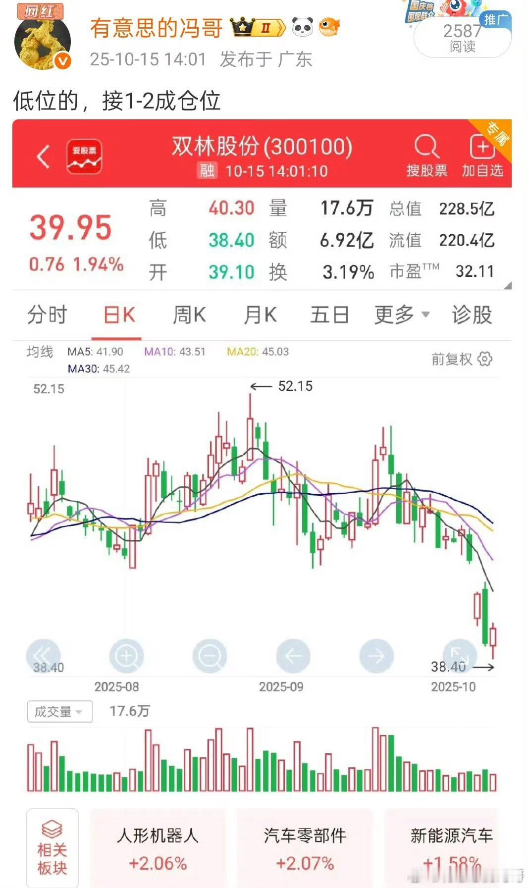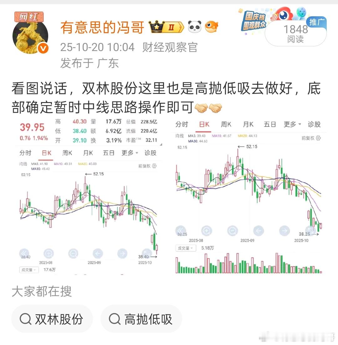 看图说话,抄底的双林股份底部开始连续反弹了,稳稳的吃肉非常舒服,恭喜大家阿[握手