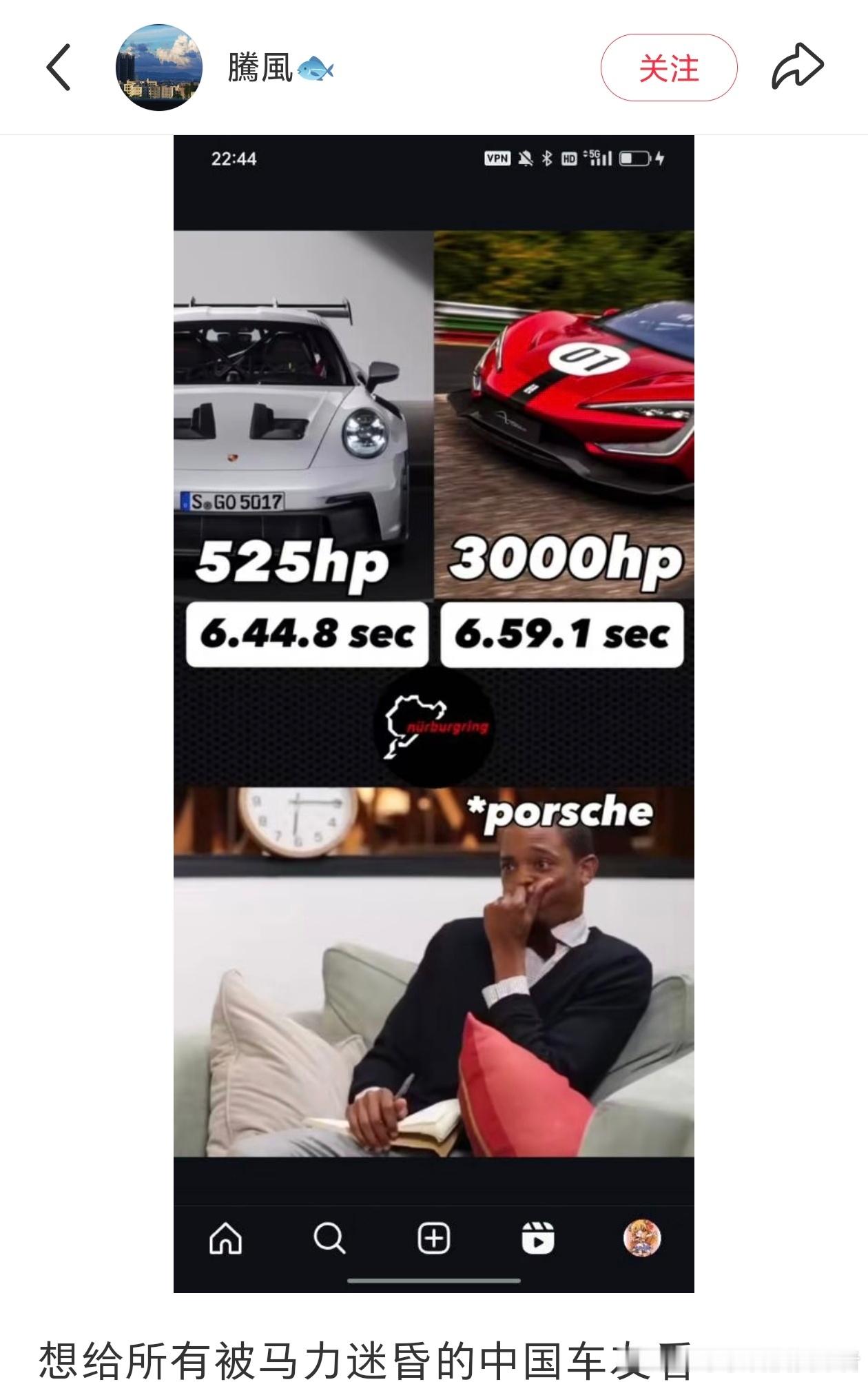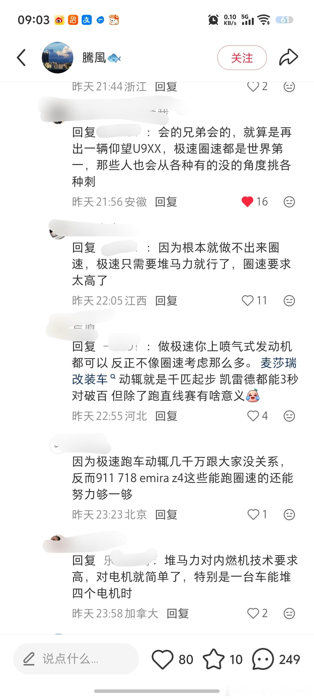 看个乐子,网友拿着专门跑圈速的保时捷对比以极速为导向的仰望U9X,以此来证明大马力没意义的事。下面还有网友跟评,说极速只要堆马力就行,而圈速要求太高了;还有的说极速对内燃机要求高,对电车来说很简单。
