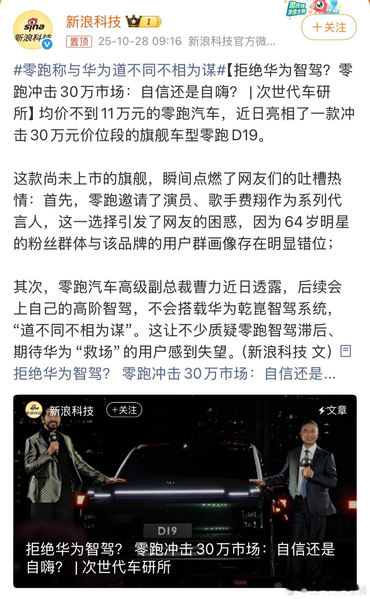 零跑从10万级市场冲击30万价位,推出D19的动作本身是品牌向上的正常布局,但选代言、智驾路线的决策确实引发了讨论。费翔的国民度与品牌年轻用户画像存在差异,可能或是想借其知名度来实现破圈。而放弃华为智驾选择自研,既是对自身技术路线的坚持,也意味着要独自承担智驾体验不及预期的风险。