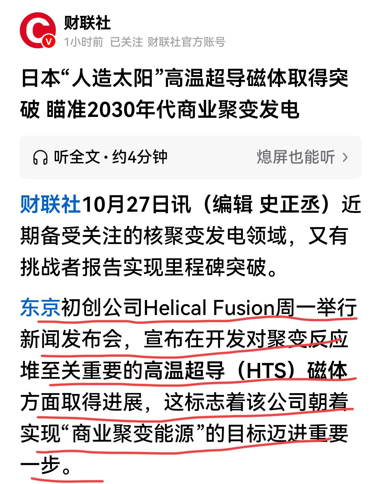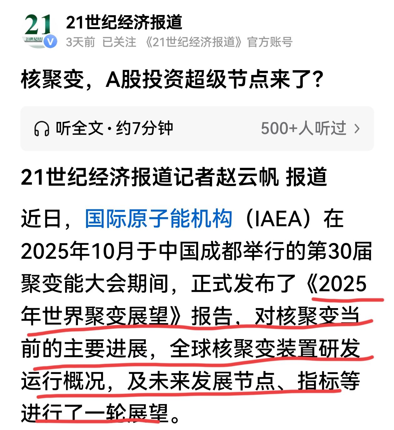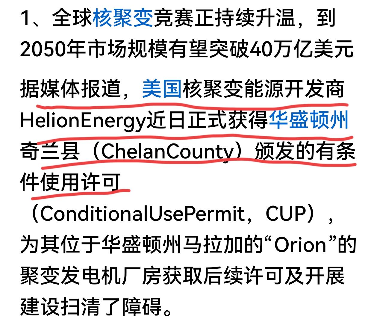 核聚变,还是核聚变,核聚变持续升温,这几天国际原子能机构、中国、美国、日本相继发布研究进展,核聚变投资超级节点到来了。 国际原子能机构;核聚变能源不再遥不可及,而且正在科学突破,产业资本和国际合作的共同推动下,加速从梦想照进现实。 中国:外交部发言人:我国紧凑型核聚变装置预计2027年竣工,有望实现人类历史上首个核聚变发电; 美国:核聚变能源开发商 HelionEnergy 近期获得有条件许可,为其核聚变厂房开展建设扫清了障碍; 日本:东京初创公司 Helical Fusion 宣布开发的核聚变反应堆至关重要的高温超导磁体方面取得进展。 核聚变的科学突破超出预期,原来观点普遍认为核聚变商用还得等30年左右,但现在的进展表明商用不会那么久,按照IAEA的话来说,就是加速从梦想照进现实。所以在资本市场上,核聚变已经不再是概念炒作,而是实打实的形成了产业。IAEA预计2050年市场规模有望突破40万亿美元,这个时间有些遥远,但国内机构统计,2025年—2030年,或有30套核聚变装置落地,总投资超过3000亿元。 核聚变是“十五五”点名的未来产业,核聚变供应链市场开启,近期相关概念股反复活跃,有实质订单支撑,核心个股还会继续舞。