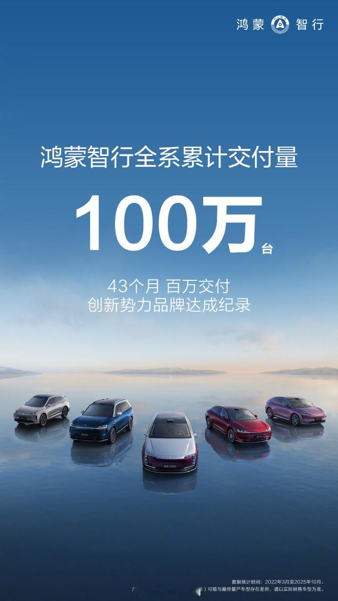 余承东正式宣布鸿蒙智行全系交付量突破100万台,仅用43个月完成从零到百万的跨越,刷新新势力品牌达成这一速度的纪录