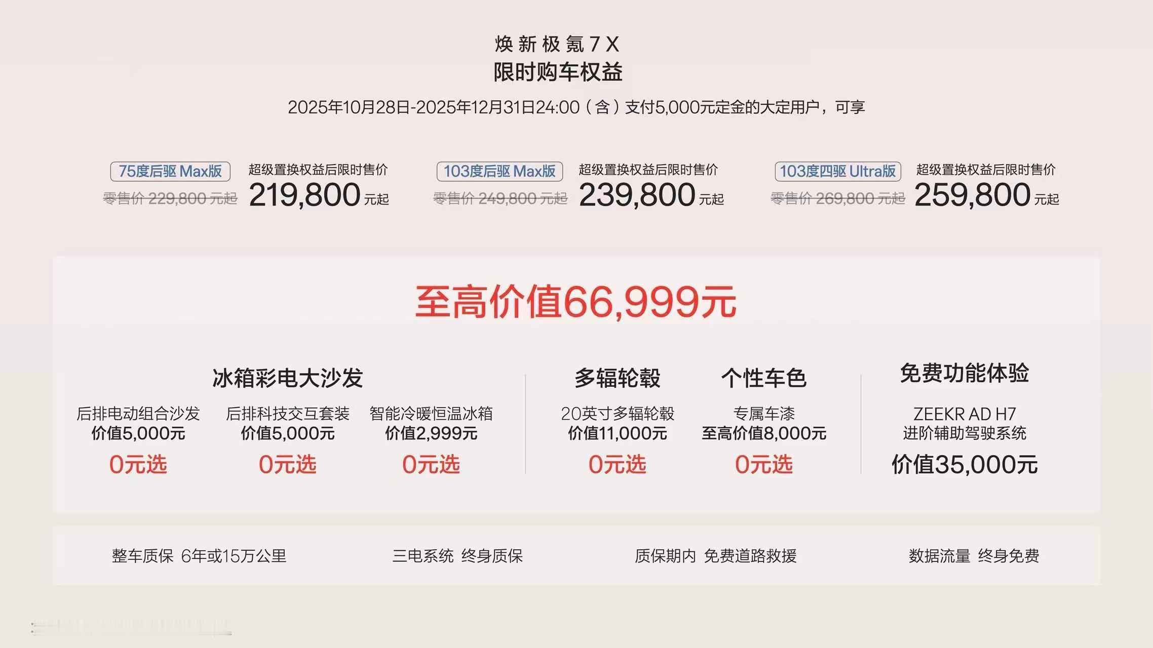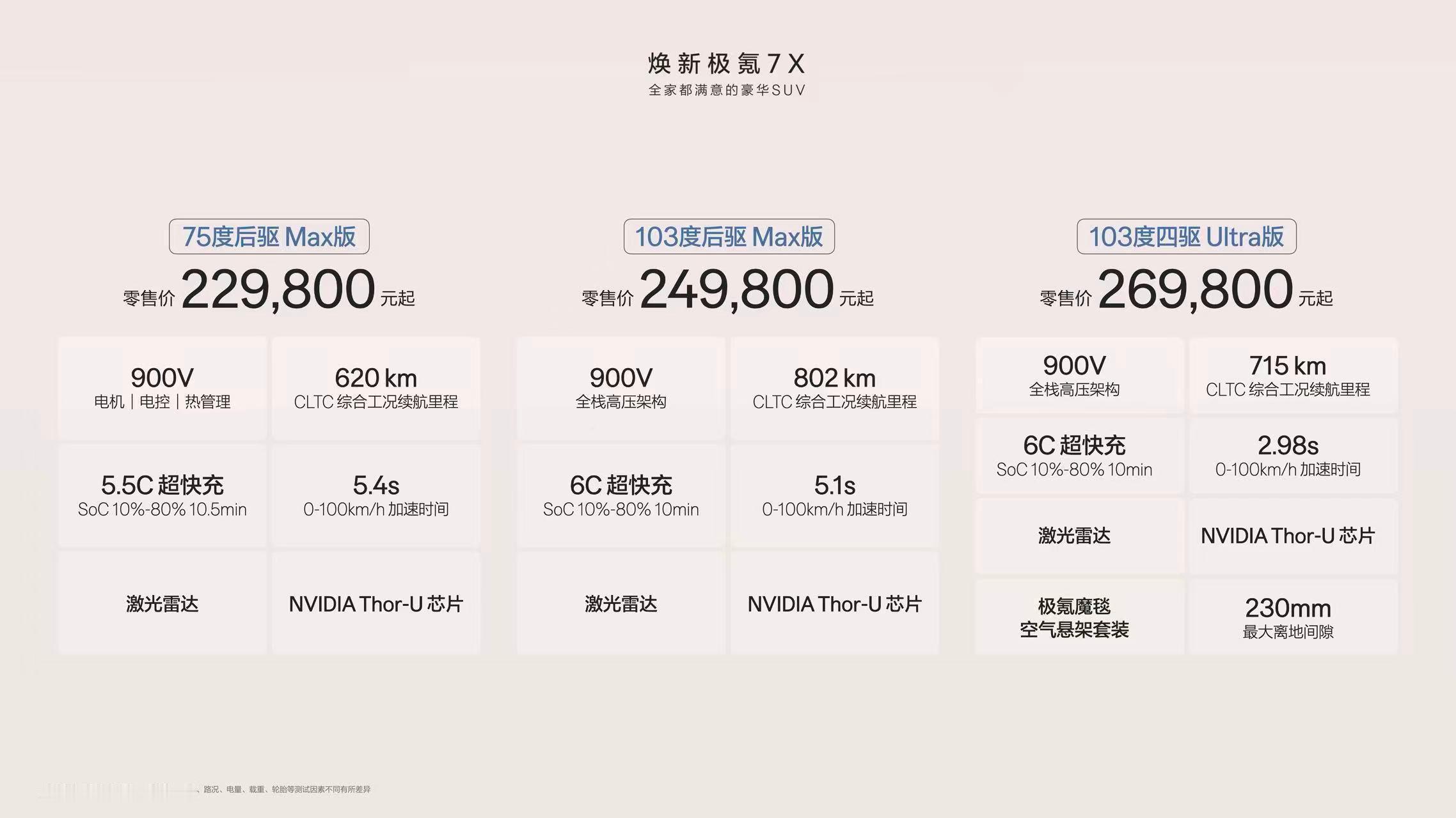 新款极氪7X正式上市,新车共推出3款车型,指导价区间22.98万-26.98万元,限时置换补贴1万元,限时售价 21.98-25.98 万元,进一步降低购车门槛。新车即日起开启交付。