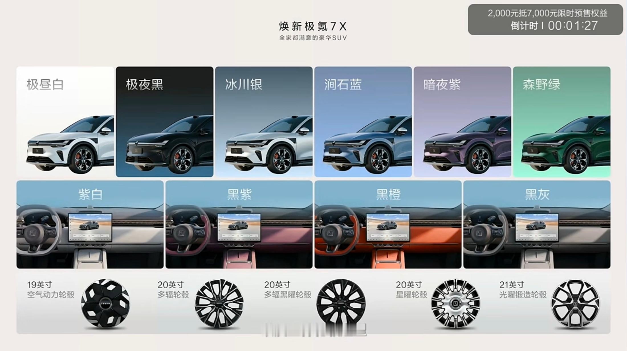 外观方面,新款极氪7X整体延续现款造型设计,拥有 0.618 黄金车身比例,运动前脸搭配动感尾部,彰显力量感与动感。核心优化在于细节:车头、车尾及车外后视镜下方均配备辅助驾驶小蓝灯,科技感提升;提供 7 款外观颜色可选,满足个性化需求。