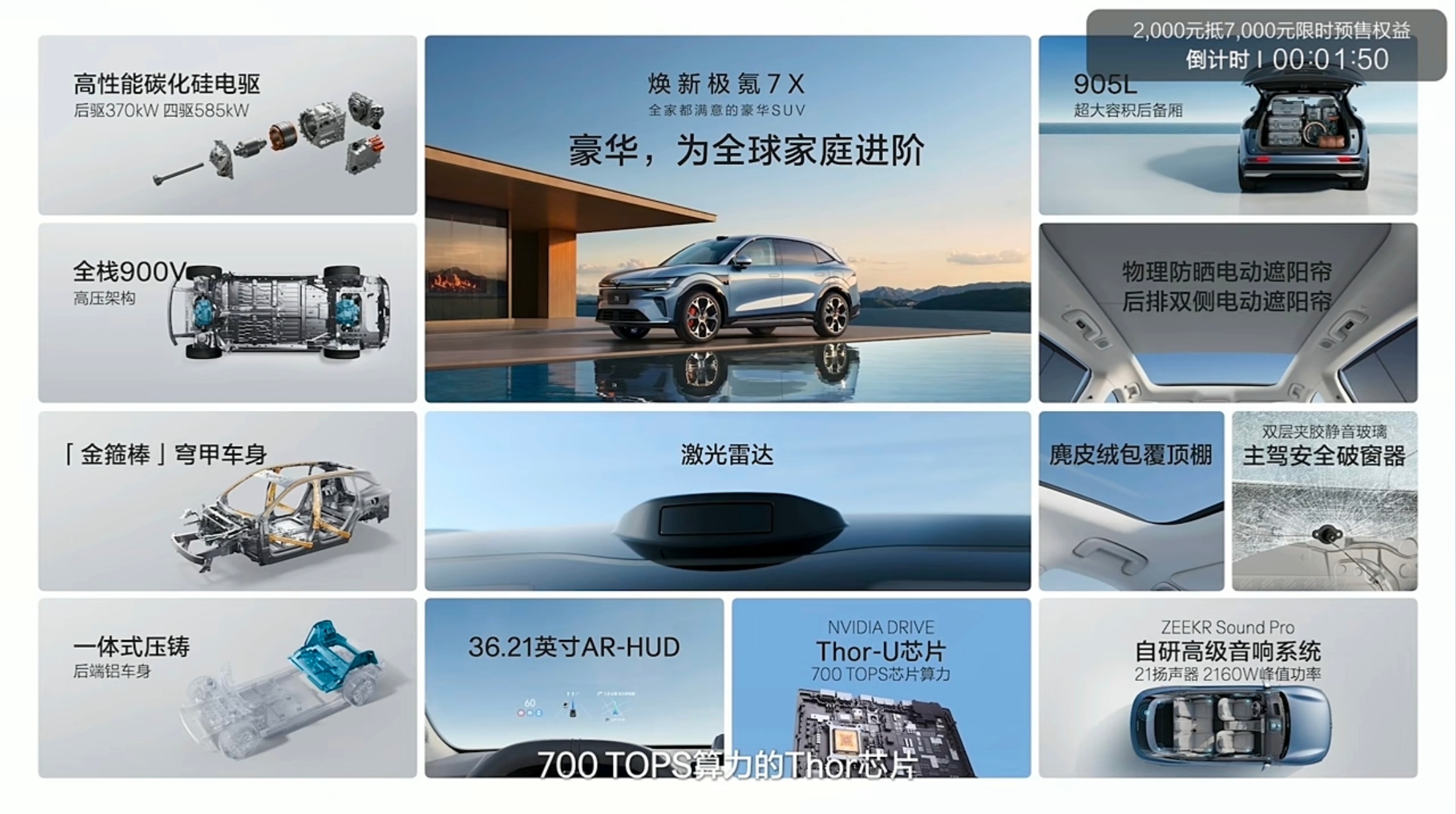 智能辅助方面,新款极氪7X 全系标配千里浩瀚辅助驾驶系统 H7,硬件搭载 31 颗超强感知硬件(含激光雷达),搭配算力达 700TOPS 的英伟达 Thor-U 芯片,再加上 Smart AI Agent 技术架构加持,智能驾驶能力全面。可实现 D2D 车位到车位领航辅助、NZP 城市自主领航辅助、APA 自动泊车辅助、RAPA 遥控泊车辅助等全场景功能,大幅提升出行便利性与安全性。