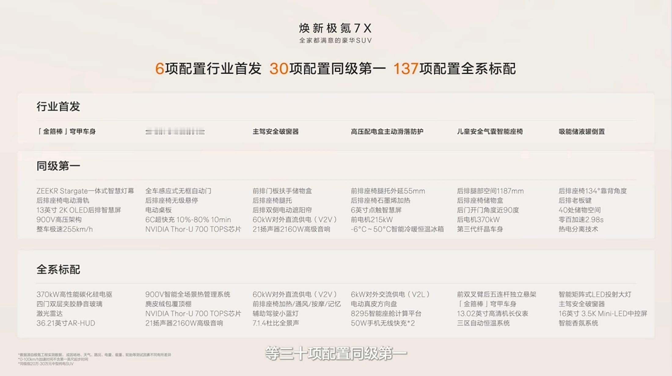 座舱配置方面,全系搭载丰富豪华配置,包括感应式无框自动门、后排双侧电动遮阳帘、后排隐私玻璃、-6℃-50℃温度调节的智能冷暖恒温冰箱;后排配备电动躺椅、电动腿托(最大调节角度 70°,支持石墨烯加热)、电动桌板、电动智慧屏及中央扶手 6 英寸点触智慧屏,舒适性与便捷性拉满。音响系统采用 21 扬声器 ZEEKR Sound Pro,最大功率 2160W,支持 7.1.4 声道杜比全景声,营造沉浸式听觉体验;还配备热石理疗、天幕电动遮阳帘、带主驾安全破窗器的四门玻璃等配置,兼顾舒适与安全。