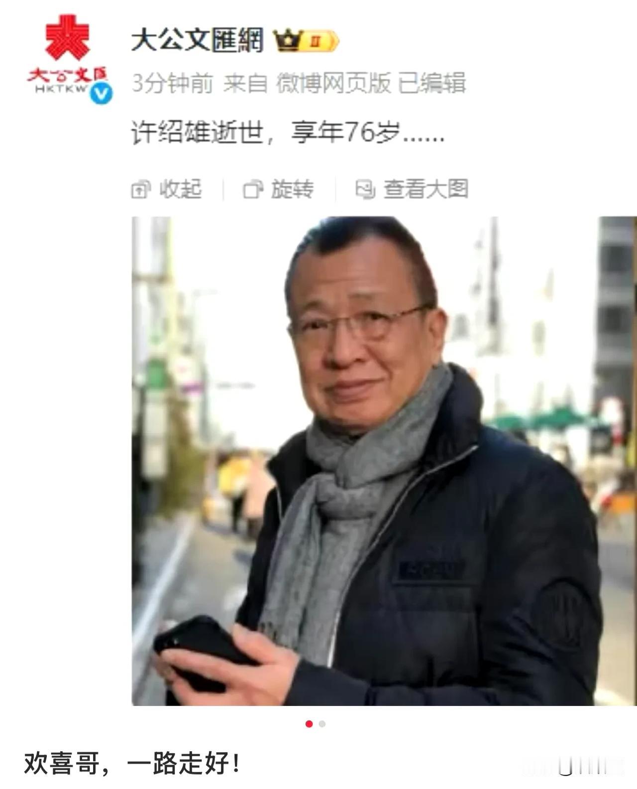 不出所料!许绍雄生病后,昨天香港群星都去看望,就有一种不详的预感,估计病的挺严重! 今天,香港媒体就确认了他去世的消息! 许绍雄76岁,年龄不算很大,很多香港艺人保养很好的,活到百岁不是问题! 许绍雄一直没有停止过演戏,不知道是不是过度劳累,也影响身体健康!