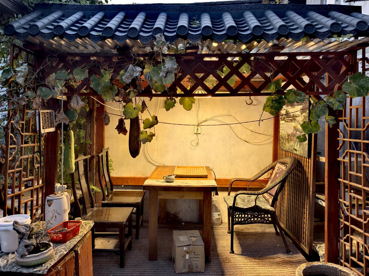 一方小院,满院秋色。 花落果熟,秋染红叶。 亭台风凉,沸茶暖身。 弯月高挂,空静