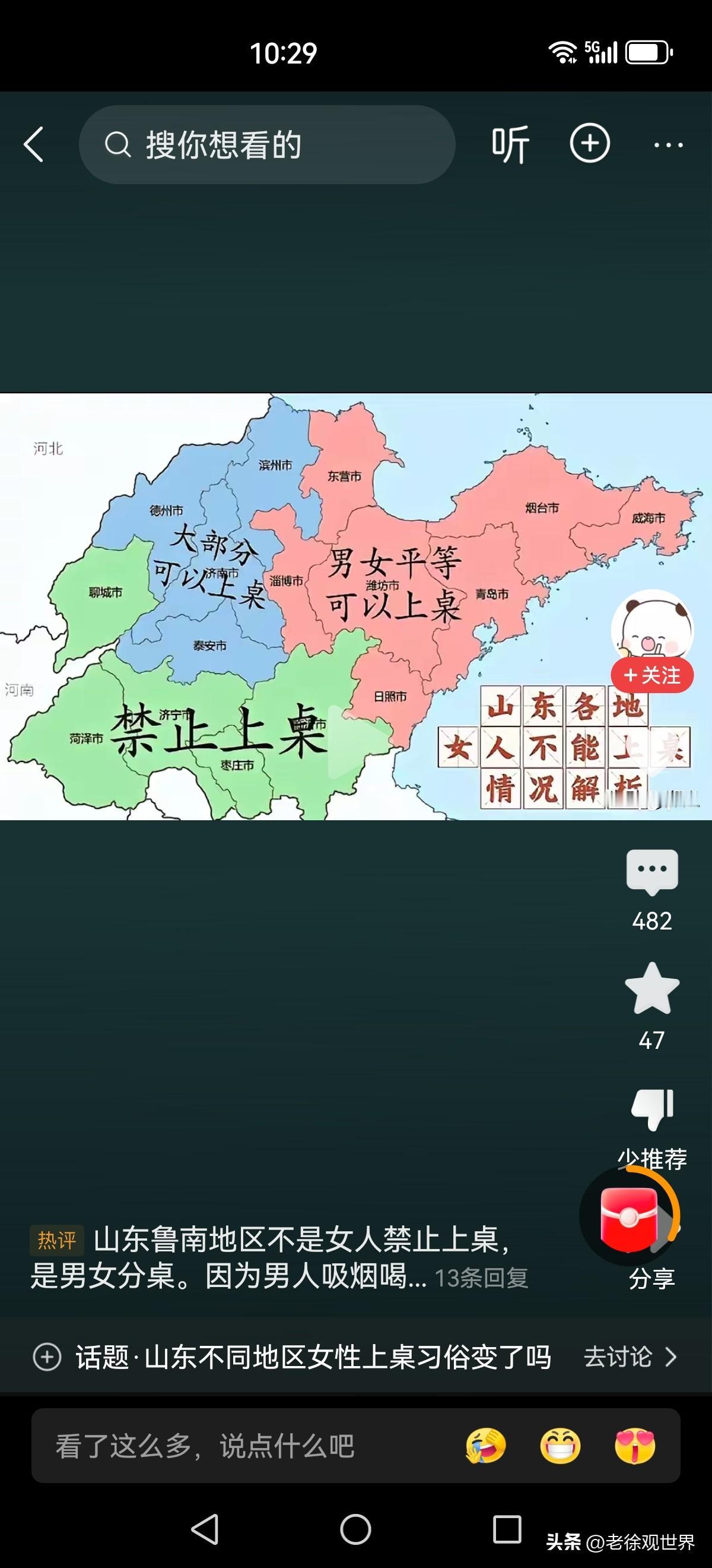 天哪,到今天了还有人在宣传山东女人不能上桌吃饭,这不是扯淡嘛! 你说的是几百年前的事。况且男女分桌,根本就不是歧视女性,恰恰相反是为了尊重和保护女性。 男人抽烟喝酒,难免会影响女性,所以分开桌子各吃各的,不也挺好吗?山东饮食习俗 山东女人长相 山东农村礼仪 山东吃席名场面 山东家庭观念 山东五姐 山东女人长相 山东人餐桌 女生吃饭