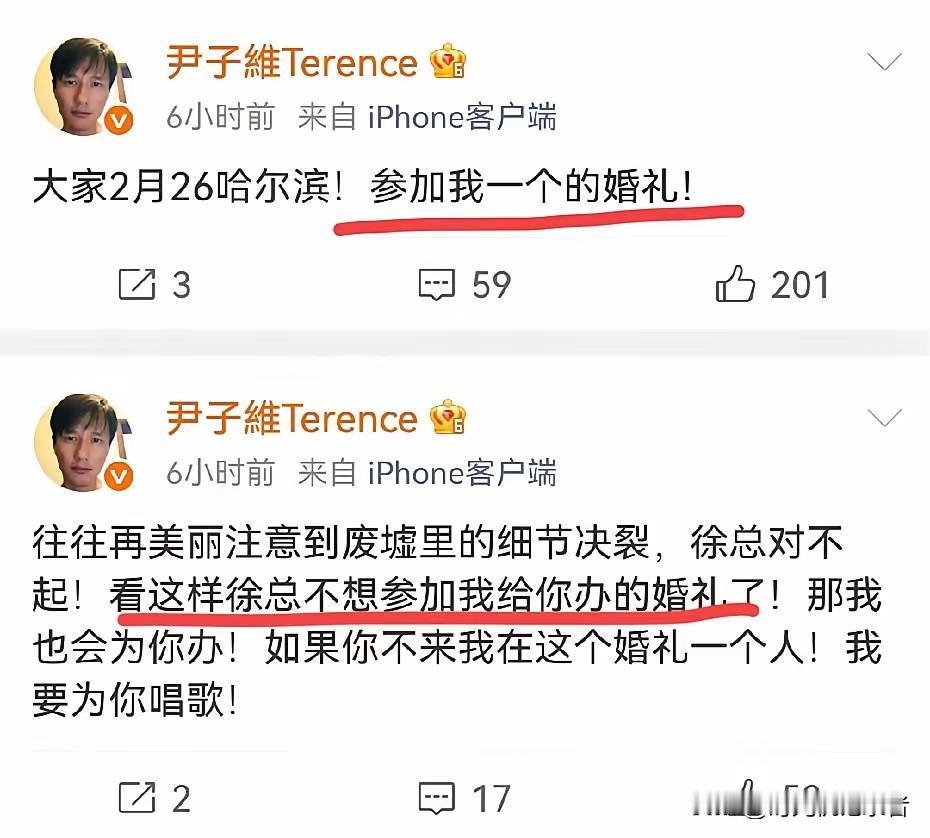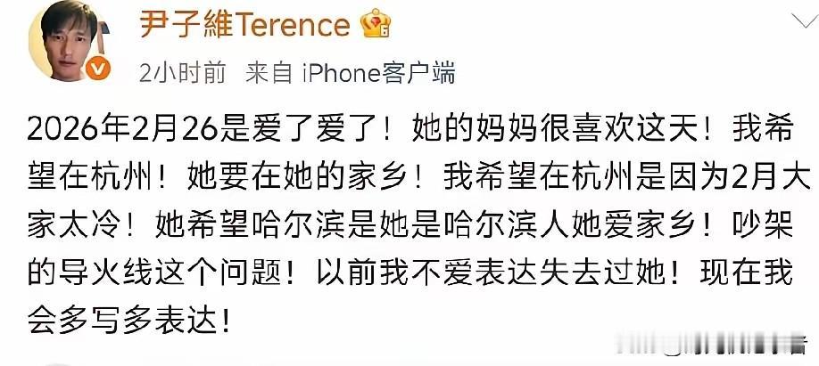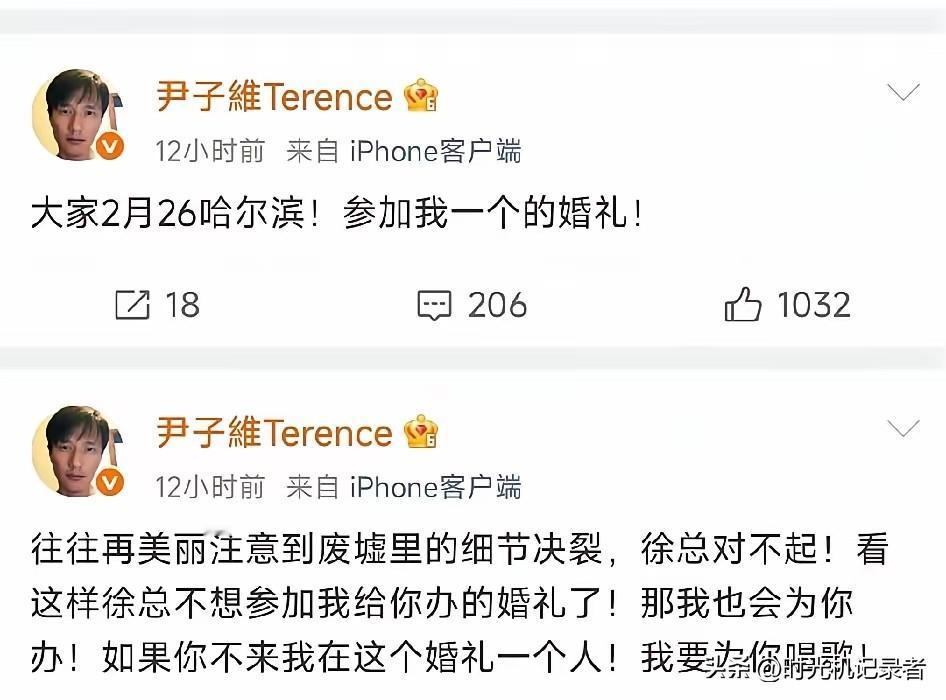 尹子维真是痴情男,和徐冬冬恋爱九年,分分合合,一直不另找她人,终于要结婚,选择地点闹矛盾,就歇斯底里发文,表达自己的决心,哪怕一个人也是要举行婚礼,