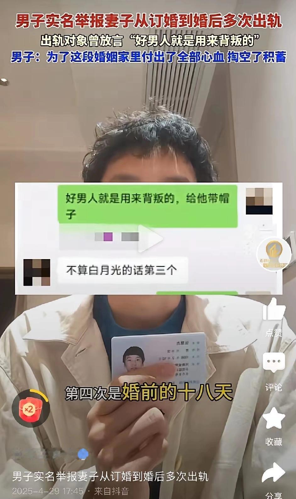 “好男人就是用来背叛的,给他戴帽子”! 任谁看到这话不生气?面对妻子多次出轨,男子无奈发在网上进行曝光。 你说说你,曝光有什么用?直接离婚不就好了? 而且这种女性她的价值观本身就是错误的,估计她的圈子也有这种人存在,所以才把出轨不当一回事。