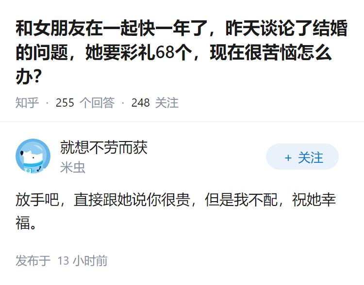和女朋友在一起快一年了,昨天谈论了结婚的问题,她要彩礼68个,现在很苦恼怎么办?