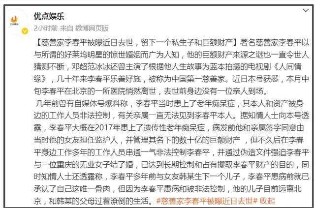 这个李春平的故事,真是比电视剧还狗血。那个曾经因为继承了一位美国老太太268亿遗产而轰动全国的“慈善家”,最近被曝已经在10月中旬悄悄去世了,死在北京一家医院,身边一个亲人都没有。 他最传奇的就是那段经历:跟了一个美国女富豪13年,对方去世后把巨额遗产都留给了他。他回国后,一边过着挥金如土的日子,一边又大把捐钱做慈善,还得了个“百年慈善第一人”的名号。但谁能想到,他的晚年会这么惨——得了老年痴呆,被人控制,甚至被安排和陌生女人结婚,财产也被人瓜分。 2017年之后,他就基本从公众眼前消失了。那时候他已经病了,之前签文件让当时的女友做监护人,帮他管理财产、照顾他和前女友生的儿子。文件里写得明明白白,他死了之后,钱全归儿子,成年之前由孩子妈管着。 可后来就乱套了。他身边的工作人员被曝出控制了他,还逼着他和一个重庆的无业女人结了婚,这摆明了就是冲着钱去的。他最后一次公开露面是过68岁生日,照片里他坐着,像个道具一样被人摆拍,看着真叫人心酸。 有人说他吃软饭,但能陪一个老人13年,恐怕也不全是假的。问题出在钱太多,他又没能力管。在澳门赌场几天就能输掉上亿,路边听人哭诉惨状随手就给十几万,这种花法,在别人眼里就是块大肥肉。 他一痴呆,身边牛鬼蛇神全冒出来了。现在人走了,这笔巨款到底归谁,估计还有得争。这个故事说到底就一句话:人要是驾驭不了横财,这钱带来的就不是福,是祸。