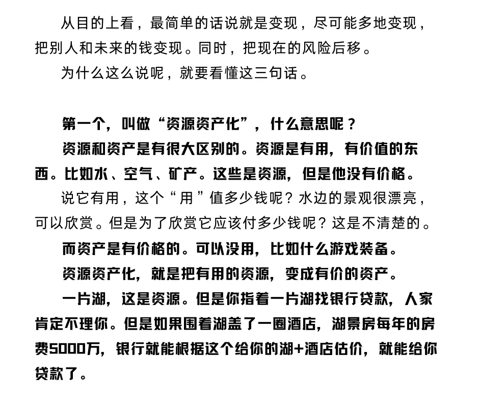 一片湖是资源。但是你指着一片湖找银行贷款,人家肯定不理你。如果围着湖盖了一圈酒店,一年房费5000万,银行就能根据这个给你的湖+酒店估价,就能贷了。