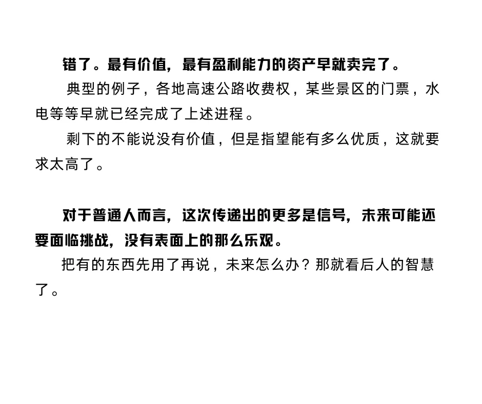 错了。最有价值的资产早就卖完了。典型的例子,高速公路收费权,水电等等早就已经完成了。
