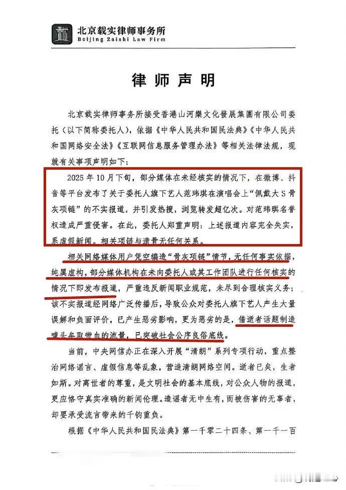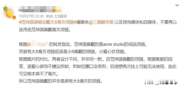 范玮琪不再忍了,揭开大S骨灰项链内情,真相曝光 近日,范玮琪因一条项链被骂上热搜,网友质疑她借大S炒作,真相究竟是什么? 10月26日,范玮琪在盐城一场商演中登台,演唱经典歌曲《可不可以不勇敢》。 这首歌因收录大小S的和声,被视为三人友情的象征。 演唱结束时,范玮琪向天空送出飞吻,引发大家猜测,她是在悼念已故好友大S。 然而,争议的焦点落在她佩戴的一条项链上。 有眼尖朋友发现,项链外形与小S此前公开的“大S骨灰项链”相似,有人质疑范玮琪“将逝者骨灰戴在身上”。 风波迅速发酵,网友怒骂:“消费逝者,毫无底线!” 面对舆论,范玮琪保持沉默。 直到10月28日,她通过经纪公司发布律师声明,辟谣: “项链为瑞典品牌成品,根本无法装入骨灰!” 声明中说部分媒体和网友“捏造事实,借大S话题赚取流量”,并宣布将采取法律手段维权。 真相大白后,曾报道此事的《三湘都市报》火速道歉,承认“未核实信息致误导公众”。 专业珠宝人士也出面澄清:范玮琪的项链与小S所戴款式完全不同,骨灰项链需定制,成品项链不可能实现。 有的网友支持范玮琪:媒体跟风带节奏,网友无脑骂,范玮琪这次真冤! 还有网友嘲讽范玮琪塑料姐妹:大S生前她们闹掰,走后倒演起深情了? 我希望以后网上的爆料,大家理性吃瓜吧。