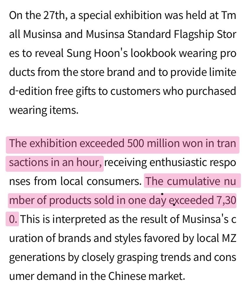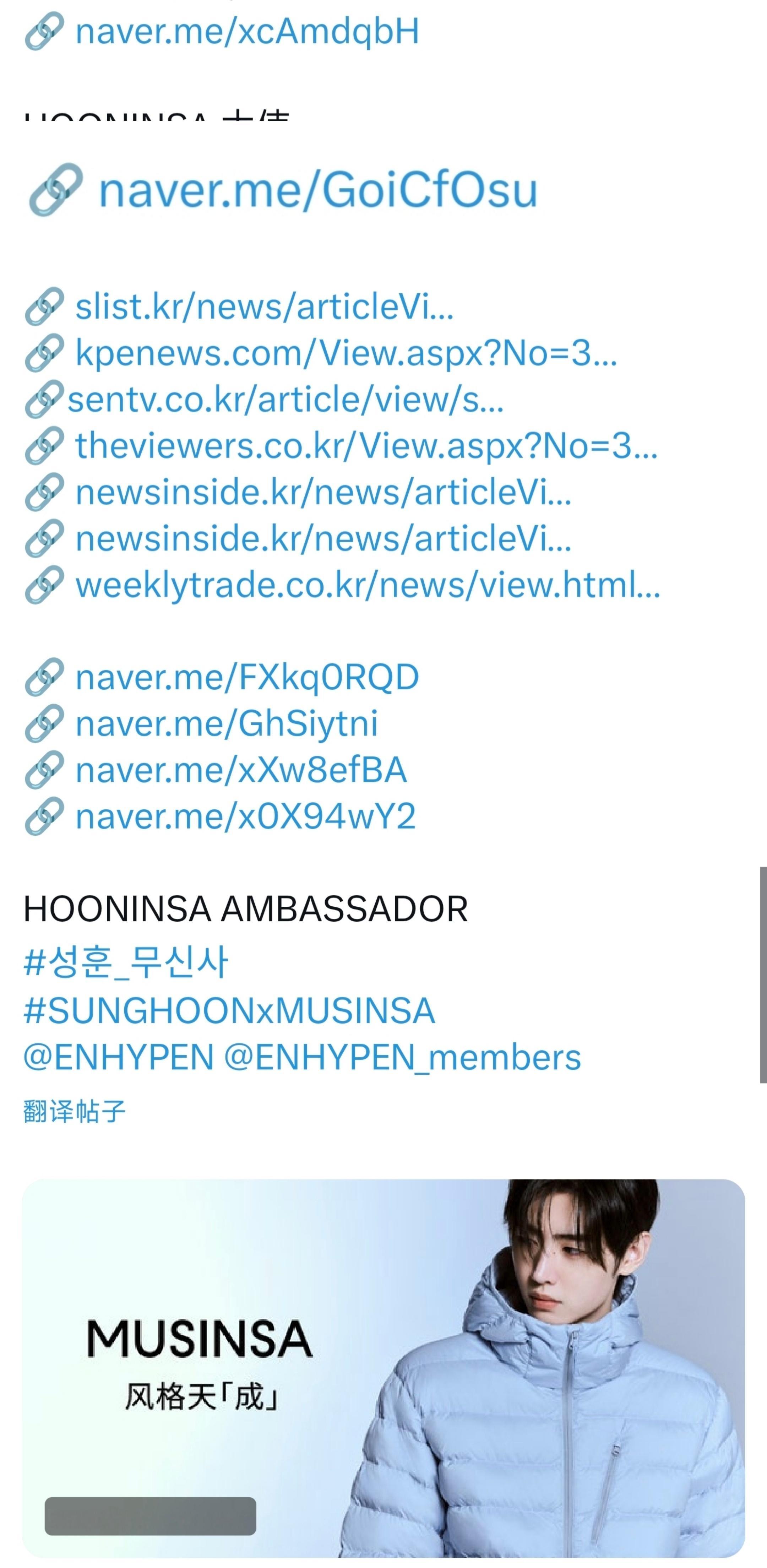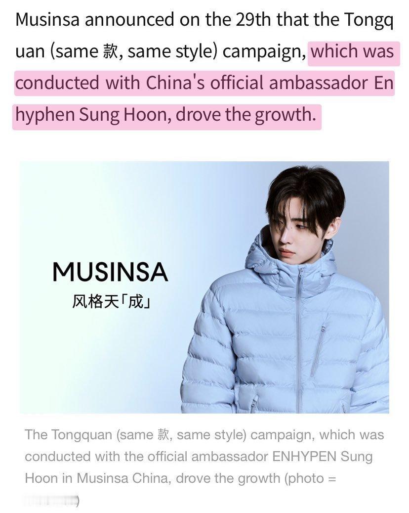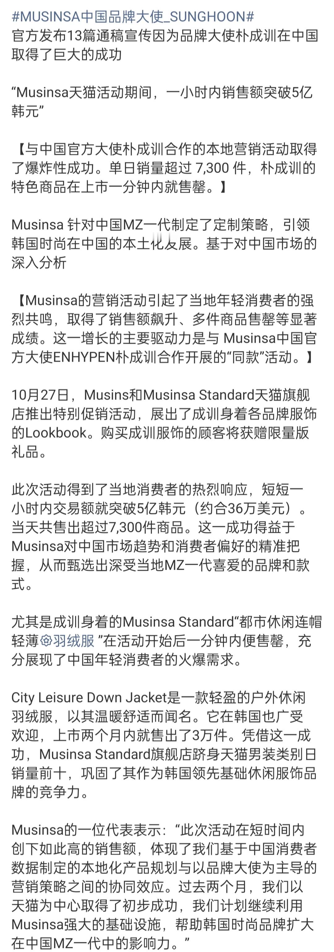 MUSINSA中国品牌大使朴成训同款羽绒服City Leisure开售仅一分钟全部售罄!天猫开售一小时成交额突破5亿韩元!