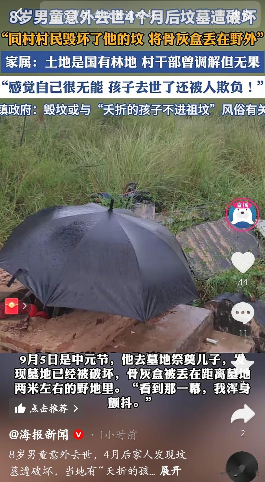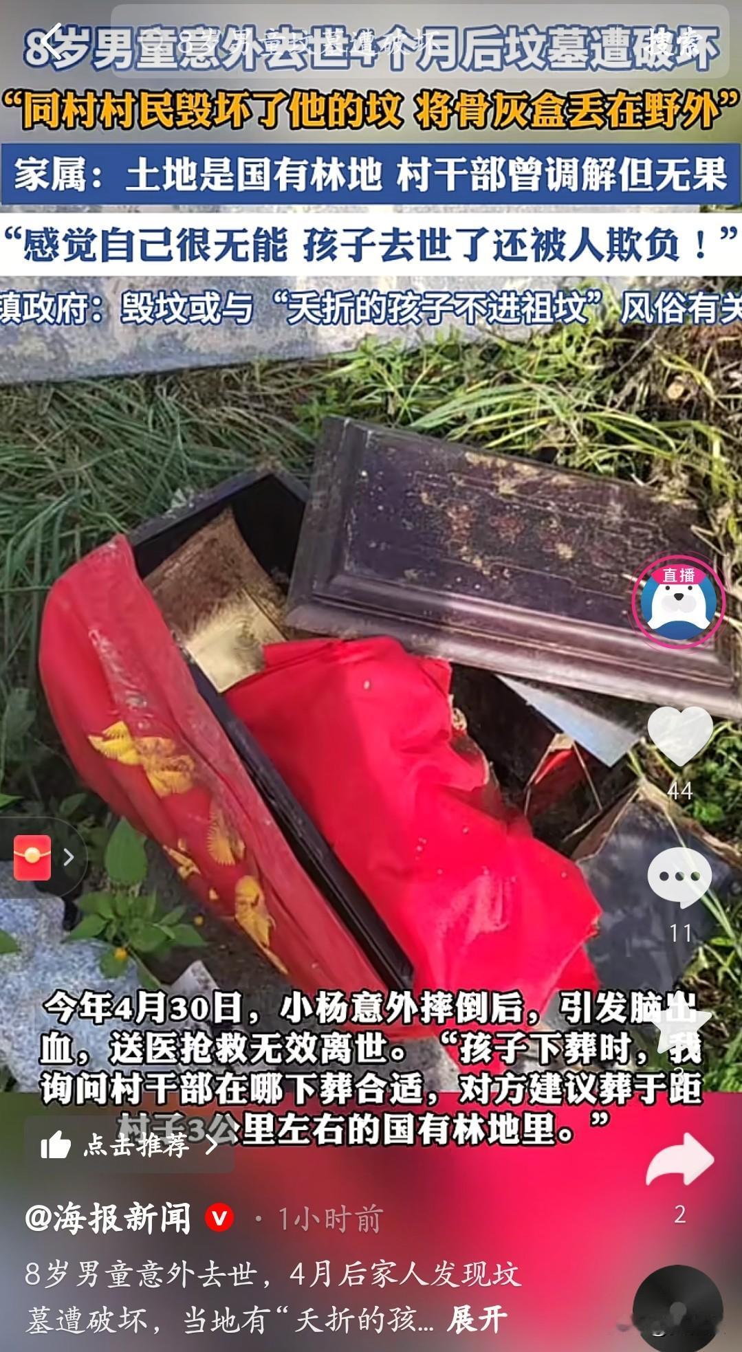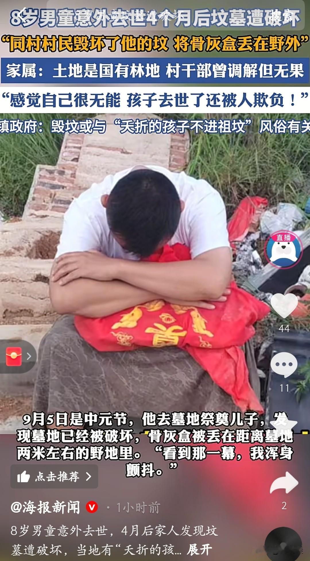 还有如此缺德的人,去剖8岁孩子的坟,把骨灰盒扔在野外。 云南大理弥渡县的杨先生,儿子小杨才8岁,还身患小脑萎缩、癫痫,是肢体一级残疾,今年4月意外摔倒脑出血去世。下葬时村干部建议葬在国有林地,可才过4个月,中元节杨先生去祭奠,就发现孩子的坟被同村人破坏了,骨灰盒被丢在野地里。 杨先生心都碎了,觉得自己太无能,孩子都没了还被这么欺负。镇政府说可能和当地“夭折的孩子不进祖坟”的风俗有关,可不管啥风俗,也不能这么干啊,这对家属的伤害得多大。希望能好好查查,给这家人一个交代,也让孩子能安息。