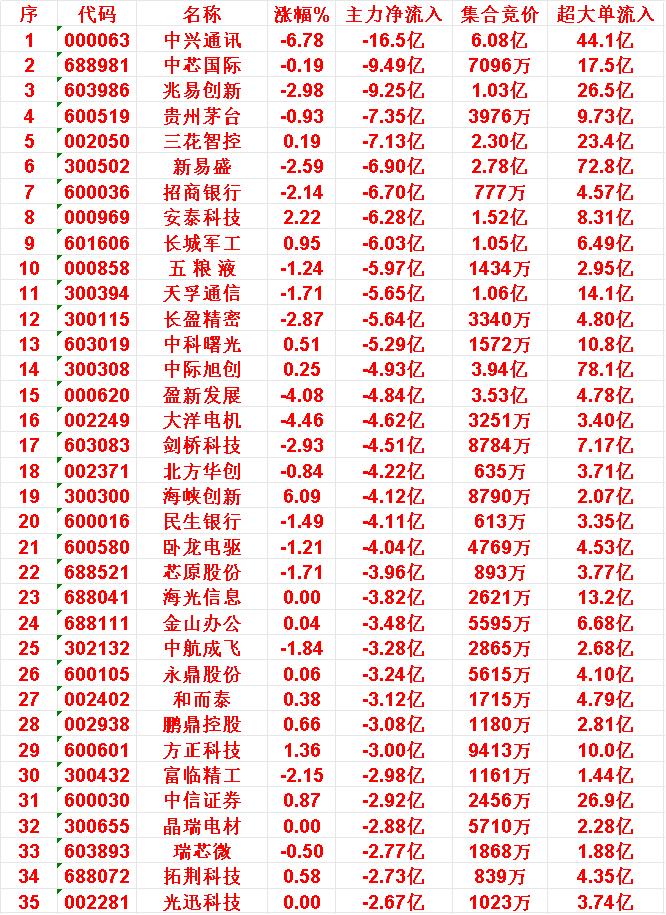 10月29日尾盘30分钟,主力资金大幅卖出的名单! 中兴通讯:净流出 16.5亿元,集合竞价成交 6.08亿元 中芯国际:净流出 9.49亿元,集合竞价成交 7096万元 兆易创新:净流出 9.25亿元,集合竞价成交 1.03亿元 贵州茅台:净流出 7.35亿元,集合竞价成交 3976万元 三花智控:净流出 7.13亿元,集合竞价成交 2.30亿元 新易盛:净流出 6.90亿元,集合竞价成交 2.78亿元