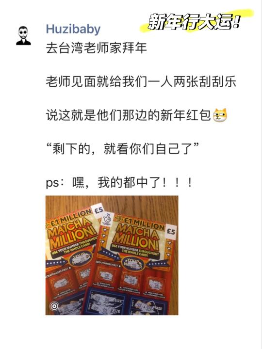 哈哈哈哈,给英国大爷加一分![派对R] 刮刮乐全中,一生要强的师弟(Well Done[doge]) 快乐的开始,必然又是元气满满的一年!! 最后祝大家新年行大运!财源滚滚来!