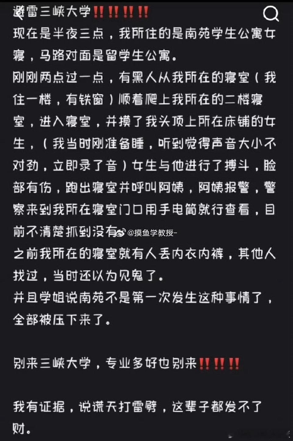 三峡大学通报留学生夜闯女寝 看到这张学生自己写的图片,后背都发毛,凌晨三点的宿舍,本该是最安稳的港湾,却成了让人胆寒的地方。希望每个在学校的女学生都能被好好保护,学校一定要负起责任,保护学生的安全。