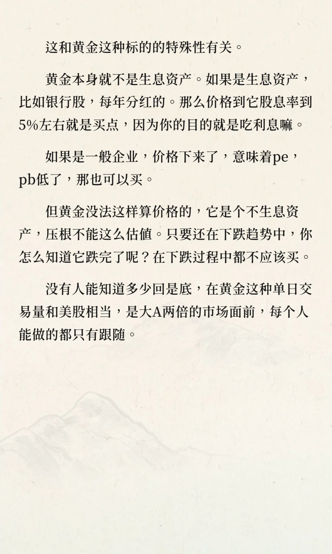没有人能知道多少回是底,在黄金这种单日交易量和美股相当,是大A两倍的市场面前,每个人能做的都只有跟随。