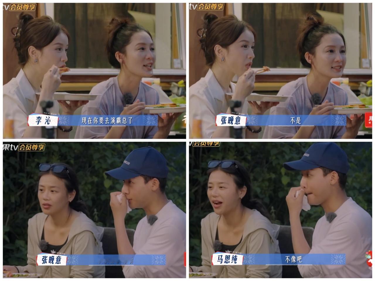 李沁好奇张晚意花少结束后 接下来的安排, 张晚意吞吞吐吐。 花少团6人都热火朝天的吃着火锅, 而张晚意在一旁不动筷子了。 马思纯一眼就看出来, 调侃他是“演员的自我修养来了”。 就是他要控制饮食, 需要减肥。 李沁好奇心就这样被激发了, 追问他到底具体拍什么戏呀。 结果张晚意没有说戏的具体名字, 就是不明确说明, 只是强调这个角色定位就是“瘦”, 上班那种戏。 也许不在芒果台播放, 所以不方便说吧。 李沁以为他要去演霸总了, 张晚意马上毒舌来了, 说“我演霸总,谁看” 马思纯马上补刀, 坦言他不像霸总。 你看, 张晚意在《长相思》的玱玹一角 就很有霸总的味道呀, 那么多网友喜欢, 谁说他演霸总没有人看呀。 李沁真的说出了网友的心声, 张晚意赶紧把霸总角色安排上呀。 不过张晚意对于这方面的角色可能不想演吧, 就借口说自己演霸总没有人看。