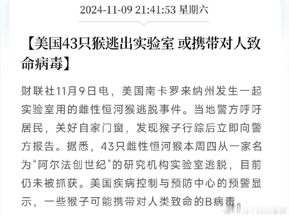 疑似携带病毒的猴子在美国逃脱2022年宾州跑、2024年南卡跑,2025年密西