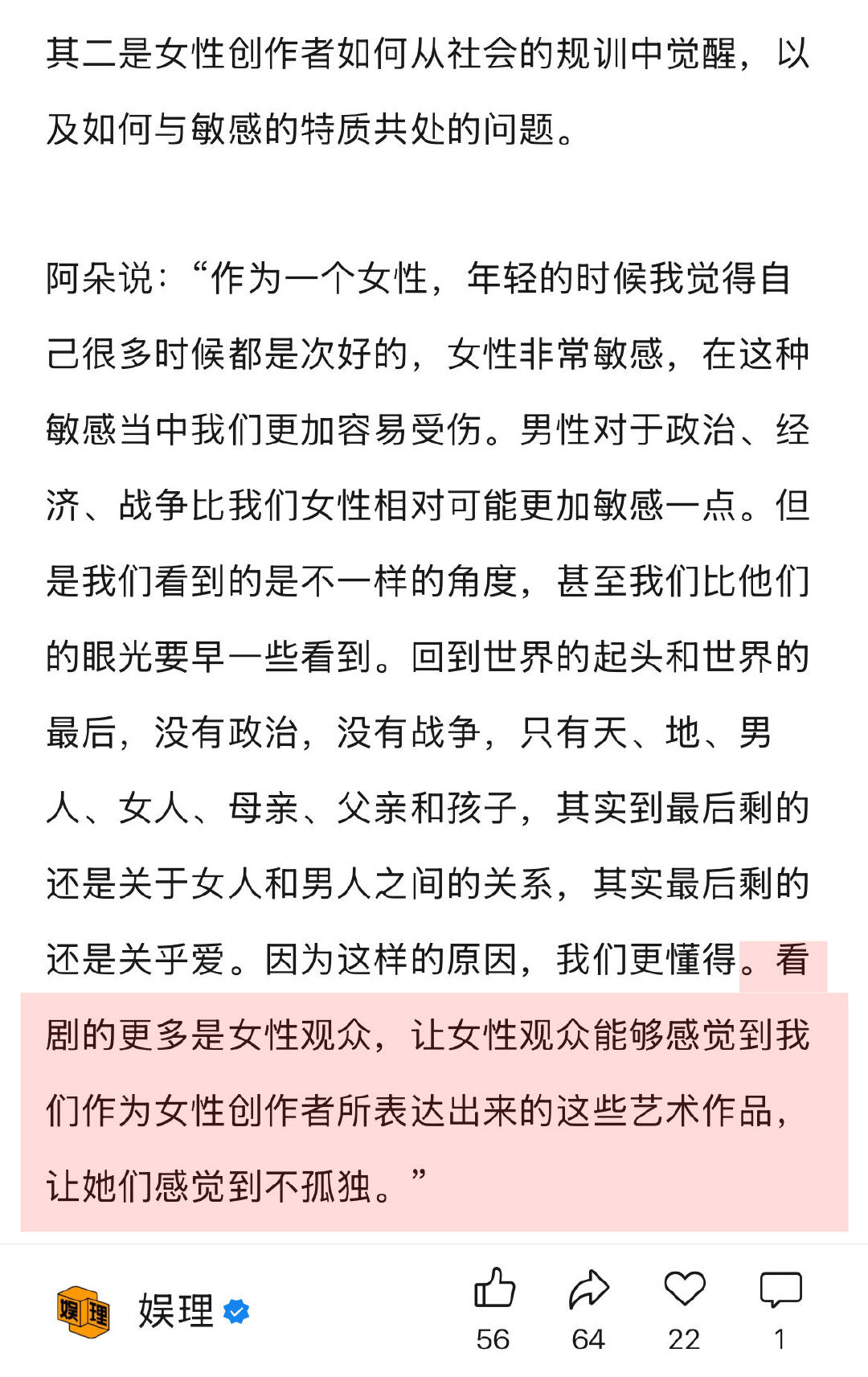 女性创作要让女观众不孤独女性创作者像野兽一样往前冲对于女性创作者们频繁提到
