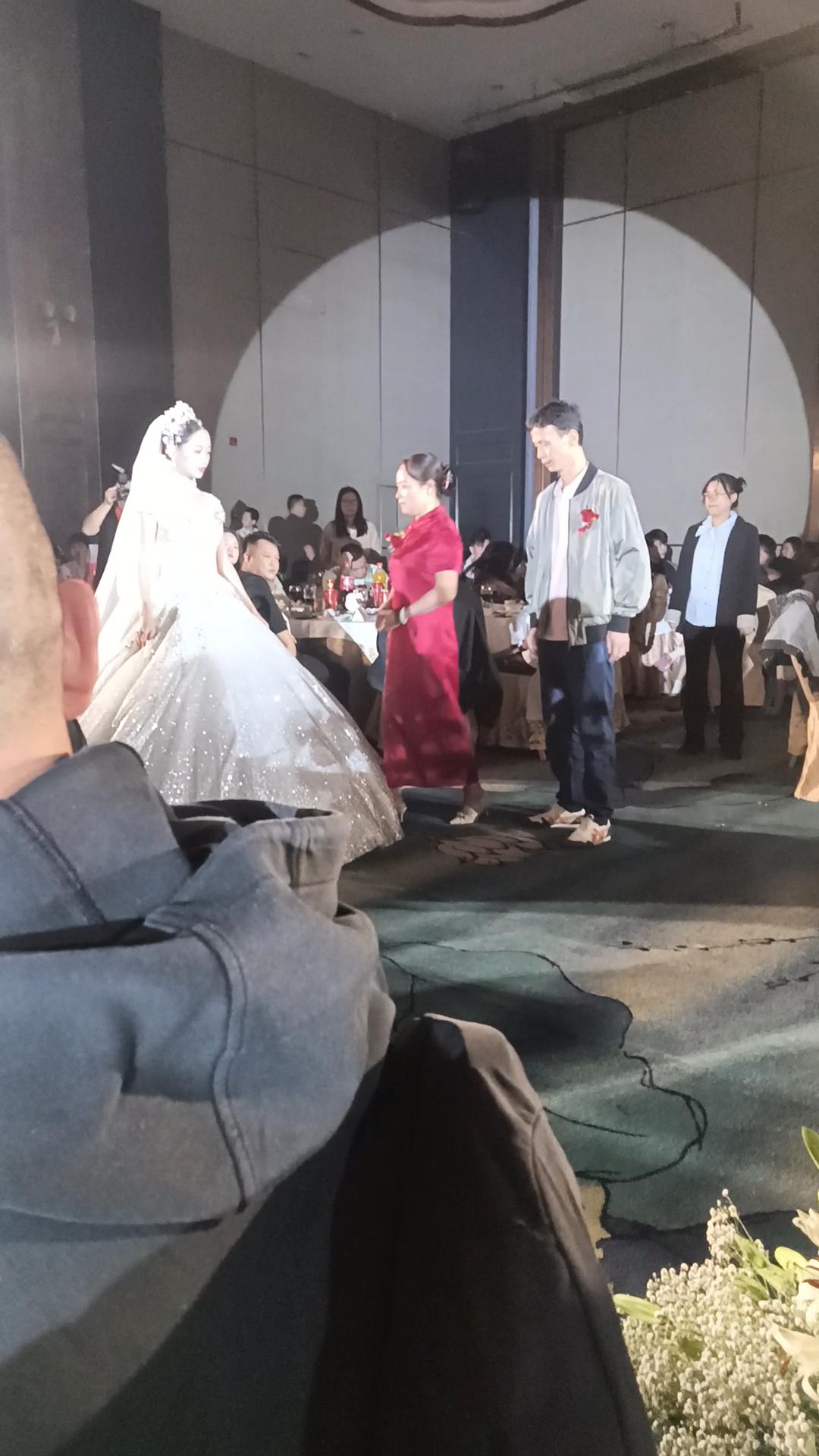 第一次代替参加爱人同学的女儿结婚典礼 鎏金酒店的旋转门缓缓打开,水晶吊灯折射出细碎的光,像撒了一地星辰。在这里要见证一场特别的婚礼——我代替有事来不了的爱人,来参加她同学女儿的婚礼。 厅内百来桌宴,早已座无虚席,我和爱人较好的同学拼桌坐在一起,暖黄的灯光裹着淡淡的百合香,大屏幕上循环播放着新人的婚纱照片。主持人穿着笔挺的西装,声音温和又富有力量:“爱情是跨越山海的约定,今天,我们齐聚于此,见证两颗心的相守。” 音乐渐起,红毯尽头的门被推开。新娘穿着洁白的婚纱,头纱轻垂,手里攥着捧花的指节微微泛白,眼里却亮得惊人。她的父亲站在身边,鬓角有些斑白,西装熨帖得没有一丝褶皱,却掩不住微微颤抖的肩膀。 他牵起女儿的手,一步一步踏上红毯。每一步都像踩在时光的琴键上,敲出二十多年的养育与牵挂。走到红毯中段,新郎已等候在那里,西装革履,眼神里的期待几乎要溢出来。 父亲停下脚步,郑重地将女儿的手交到新郎掌心。两只手交叠的瞬间,他拍了拍新郎的手背,千言万语都化作一个深沉的拥抱。新娘转身抱住父亲,头埋在他肩头,婚纱的蕾丝蹭过父亲的脸颊,那一幕让台下不少人红了眼眶。 交换戒指的环节简单而郑重。新郎轻轻的将戒指套进新娘的无名指,新娘的指尖轻轻颤抖;轮到新娘为新郎戴戒指时,她抬眼望他,眼里的笑意混着泪光,像盛了一汪春水。主持人笑着打趣:“此刻,是不是该有个吻了?” 台下立刻响起热烈的掌声和口哨声。新郎轻轻在她额间印下一个温柔的吻,随后是鼻尖相抵的缱绻。掌声像潮水般涌来,一波高过一波,连角落里的服务生都忍不住停下手里的活,笑着鼓掌。 仪式的最后,双方父母走上台。四位长辈站在新人两侧,脸上是抑制不住的喜悦。新娘的母亲悄悄抹了把眼泪,又赶紧笑着看向镜头;新郎的父亲满脸的皱纹,眼里满是欣慰。摄影师喊“三二一”时,所有人都望向镜头,闪光灯亮起的瞬间,定格了这一大家人的幸福。 我坐在席间,看着这热闹又温暖的场面,拿出手机给爱人发了一段新朗新娘拥抱的视频,发送键按下的瞬间,周围又响起一阵欢呼,原来新人正在向台下的伴郎伴娘扔一束花,花在空中划出弧线,就像一个小小的祝福,不知道会落在哪位幸运人的手心里。
