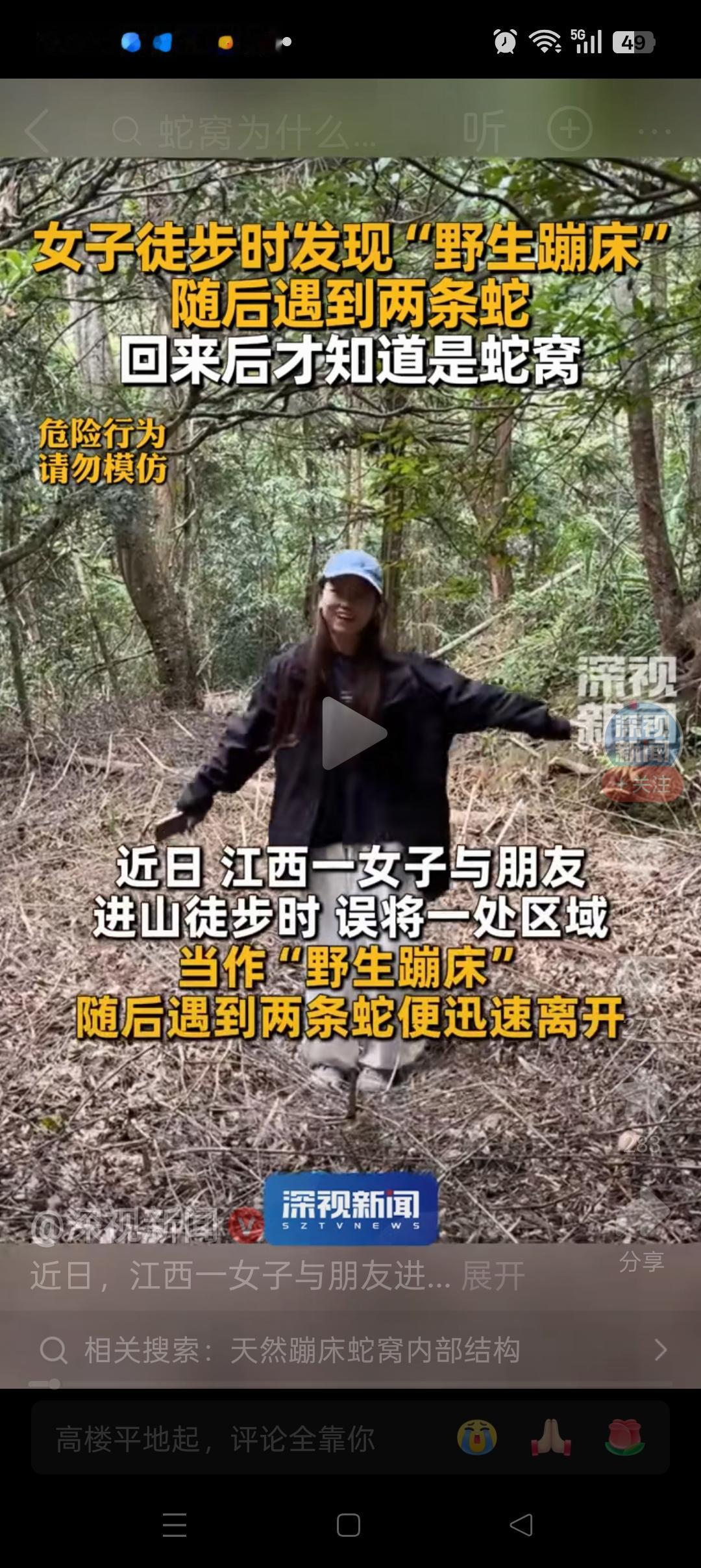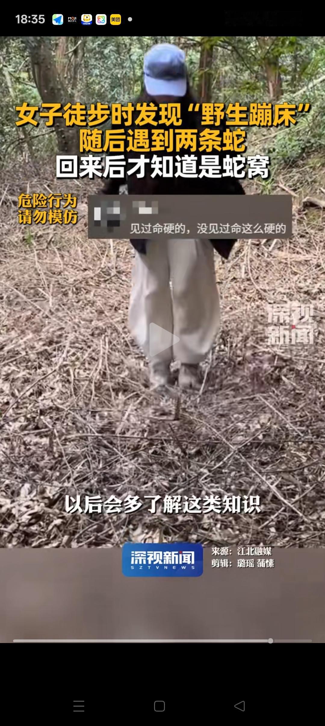 “胆子真大”,江西,一美女在山里徒步时,遇到一块非常柔软的区域,她高兴的在上面又蹦又跳,直到看到两条蛇从里面爬出来,她才立马跑了。 直到看到评论,她才意识到原来那很可能是一个蛇窝,表示以后再也不敢玩了[捂脸] 真的服了这种人,就算不是蛇窝,一般有常识的人,遇到这种软软的区域,都会第一时间离开。她还故意在上面跳来跳去,真不知道咋想的 得亏这上面还比较结实,要不然后果不敢想。这一次算你走运,下次别玩了啊。。
