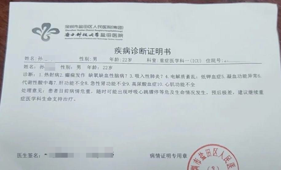 与小孙同行的一名朋友告诉红星新闻,他们事后反思,第一是药品和电解质水准备不充分,当时爬的时候流了很多汗,没有及时补充电解质水,又一下子喝进了太多纯净水,才会导致电解质紊乱;第二是对热射病了解得太少,前后花了三小时才送到医院。孙先生称,儿子小孙被辗转送到深圳多家医院抢救,医生称儿子的肾、心、肝等主要器官都被烧坏。医生告知他小孙能否顺利度过一个星期苏醒期,决定其今后是否会脑梗或成为植物人。