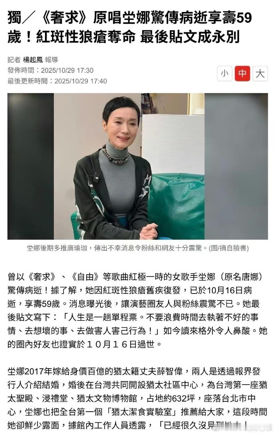 台湾歌手坣娜去世刚听到消息时整个人都懵了。耳机里还循环着她的《奢求》,那个歌声里藏着故事的姐姐,终究还是不忍病痛走了。40周年演唱会再也等不到了,愿天堂没有病痛,只有自由。