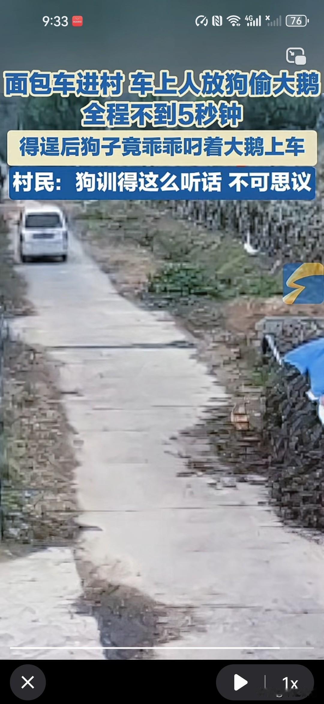 这狗可真是“狗性十足”! 狗倒是条好狗,只是狗主人太差劲! 近日在江苏连云港,一辆面包车驶入村庄,放狗去偷大鹅,整个过程不到3秒,得手后狗子叼着大鹅上了车。 村民看着监控表示:这狗被训得如此听话,技术高超,实在神奇! 这狗训练得还不够好,厉害的狗能来回跑三趟,一趟叼走一只!