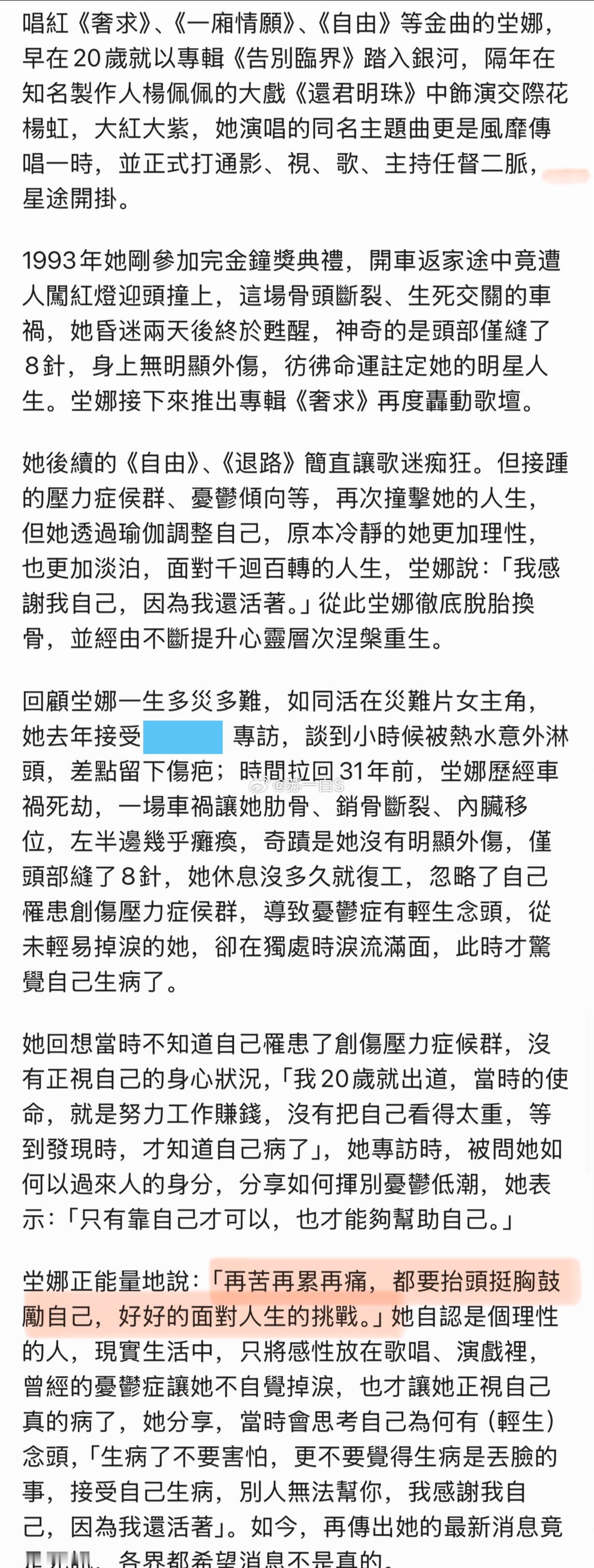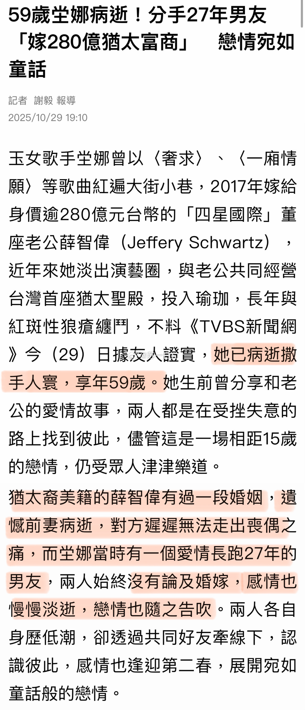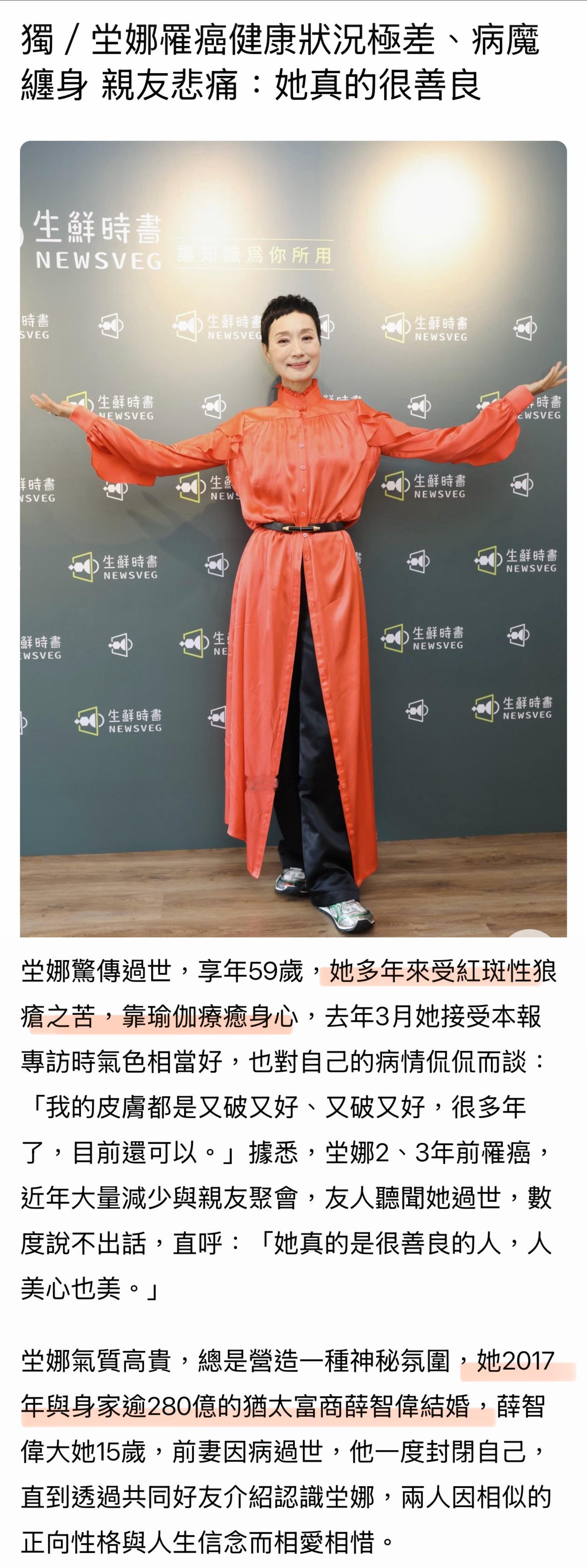 台媒报道说,女星坣娜去世了,网传是因为红斑性狼疮旧疾复发,于10月16日病逝,享年59岁。