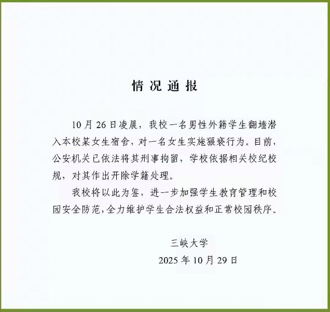 黑人留学生深夜闯女生寝室,这事放在谁身上都觉得可怕,这完全是漠视中国的法律。 事发在三峡大学,没错就是在我国的大学,竟然能够做出如此下三滥的事情,这始作俑者是一名外籍的留学生,深夜从窗台爬上女生宿舍的二楼,并且试图对一名女生实行猥亵。 这太可怕了,这外籍留学生简直是色胆包天,好处是女生们的勇敢,共同反抗,没有让对方得逞。 目前来看该留学生已经被拘留,学校也是对此开除学籍的处理,至于是不是黑人并没有说明,目前学校已经是对女生宿舍的2楼加装了防护铁丝网,1楼是已经是铁防护网。 这种事情太可怕了,大半夜的潜入女生宿舍,并且还把人家宿舍的女生头部都摸了一边。希望校园对于留学生加强管理。